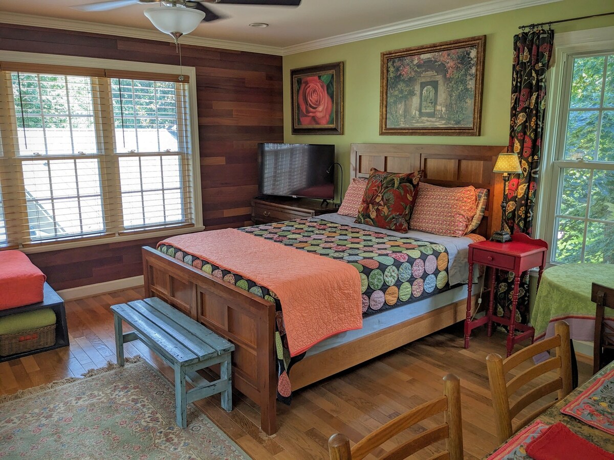 Walk down the path to your mini suite: a cozy studio with an open floor plan, kitchenette (microwave & toaster over), clawfoot tub with shower, queen bed, & private deck. Great for 2 guests or place to work remotely. A 5-min walk to scenic lake/trails. In a very quiet neighborhood, it's not a good fit for gatherings or folks coming & going at all hours. Please no smoking/vaping of any kind in/on premises. 10 min drive to GAC, Tanger, UNCG, A&T, Coliseum, Guilford College & 25 mins to High point.