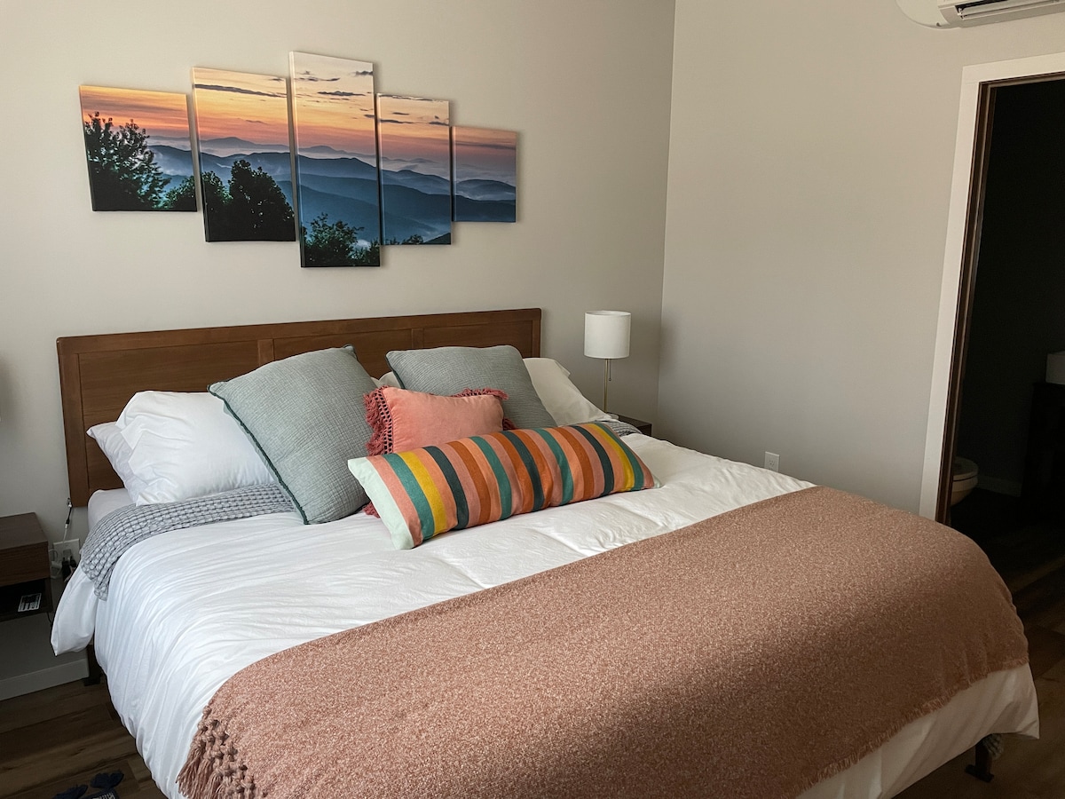 The Flat at Friendly is a renovated 700 sf lower level apartment of a mid-century home-- an easy 4 minute walk to Friendly Center; Greensboro's premier shopping, dining and entertainment destination which neighbors The O'Henry and Proximity Hotels. Features a stylish living room, modern kitchenette, new bathroom and queen bedroom. Keyless entry makes check-in and check-out easy. 5G WIFI Network. Walk to two of the area's most visited outdoor attractions: the Bog Garden and Bicentennial Garden.
