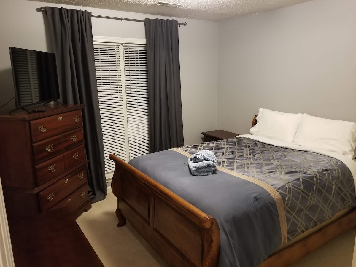 Come join us just a few minutes out of downtown Greenville, away from the hustle and bustle of the city. This unique and sophisticated 2nd floor apartment has all of the amenities you will need for an extended stay. An inviting queen sized bed awaits with a brilliant spa-like bathroom; the clean and contemporary vibes will replenish your soul. Free parking and lightning fast Wi-Fi will put a smile on your face, whether you are streaming your favorite shows to binge watch or logging into work.