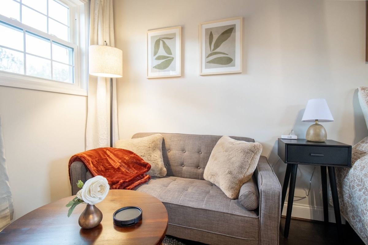 Newly renovated in 2021, very comfortable guesthouse located in a quiet neighborhood just 10 minutes from downtown Greenville. Created by highly experienced bed and breakfast owners, this space is carefully crafted to be a relaxing, restful place for travelers. Two bedrooms, a kitchen with brand-new appliances, dining area, smart TV, a desktop space, WiFi, and an outdoor porch spot to enjoy nice weather days. Note that if you search the address on Google, it will pull up photos before renovation