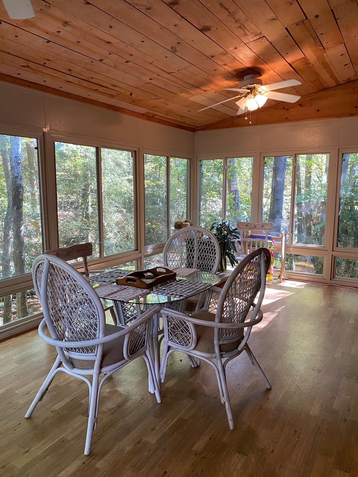 Great Cabin on the Creek, relax, enjoy the incredible breeze off Matthews Creek from the comfort of the Sun Room. Sit back on the covered front porch, or at the fire pit and watch the kids and pets inside the fenced yard. Relax in the Sun Room watch the water, play games, craft or read. Perfect place for your Yoga! Hiking, fishing, swimming and outdoor living abound! Finally a truly Rustic Cabin! Pet Friendly! $75.00 per pet with a few common sense pet rules.
