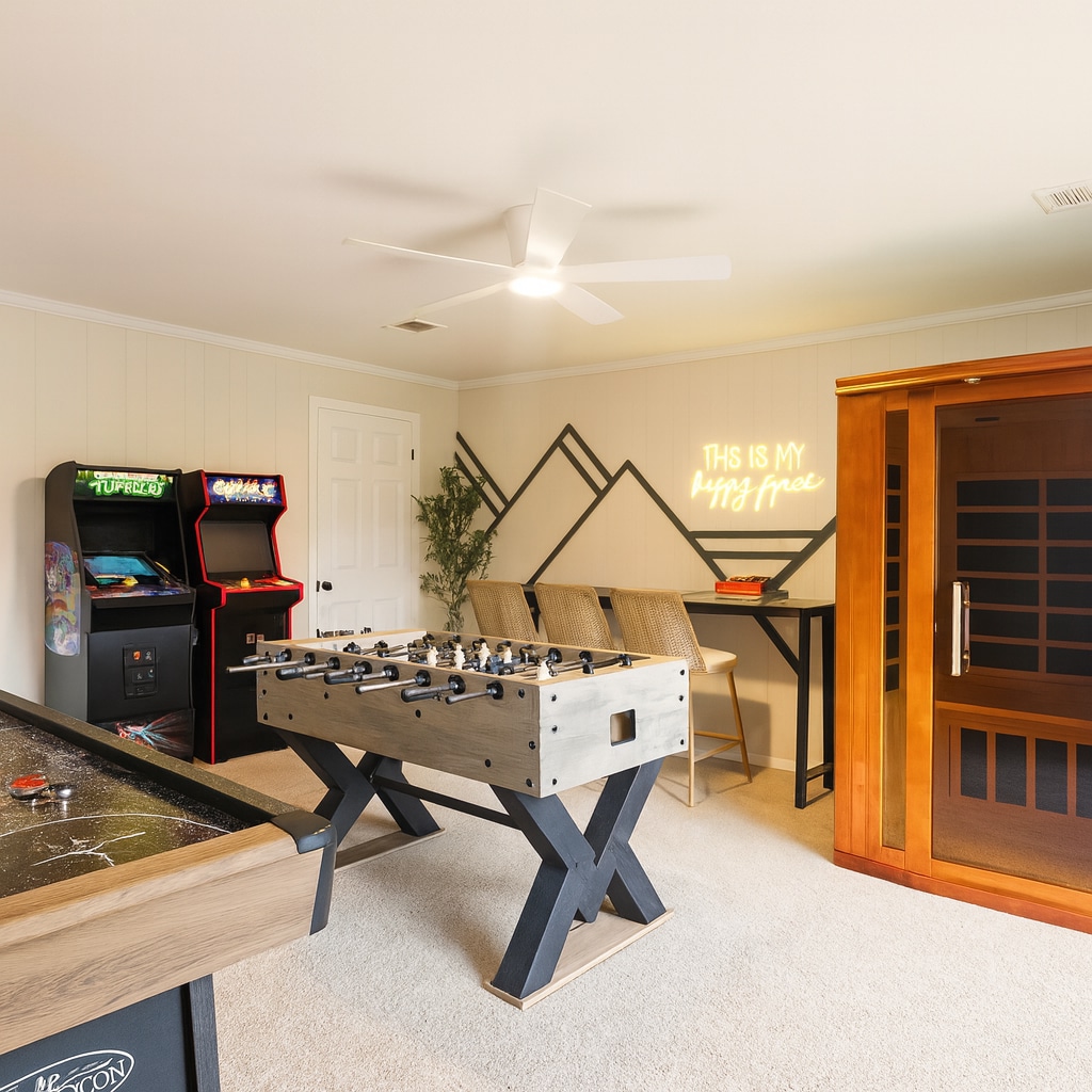Escape to Terre, a pet-friendly, modern 3 bedroom, 2 bathroom retreat in Taylors near Downtown Greenville, built for big energy and memory making. 🍃🌲 Sleeping up to 14 guests, this spacious Greenville home is perfect for family trips, golf weekends, sporting events, and friend group getaways. Located just 15 minutes from Paris Mountain and Downtown Greenville, you can adventure by day and unwind in the hot tub or game room by night.