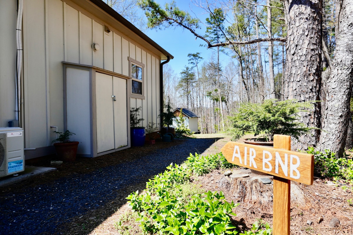 Couples retreat located 6 miles from downtown Greenville and the Swamp Rabbit Trail in a comfortable country setting. Wake up to a beautiful woods view through a large bay window and wildlife that surrounds the cottage (deer, birds and squirrels). Experience the beauty of the country in the city! Enjoy the eclectic collection of art and design in this cute little cottage.