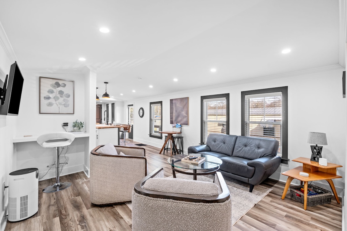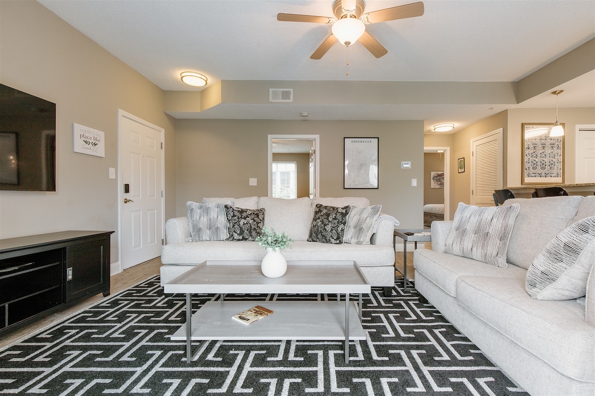 This clean and stylish one bedroom apartment is perfect for the traveling couple or creative businessperson. This rare gem offers an immersive downtown experience with a private balcony viewing the inner city from a local expert's lens. Our unbeatable location features: Self check-in, private parking, (NEW) Ultra Fast Wi-Fi, comfortable bedding & fully-equipped kitchen. It is walking distance to everything GVL is known for making it the perfect location for work, play or maybe an extended stay!