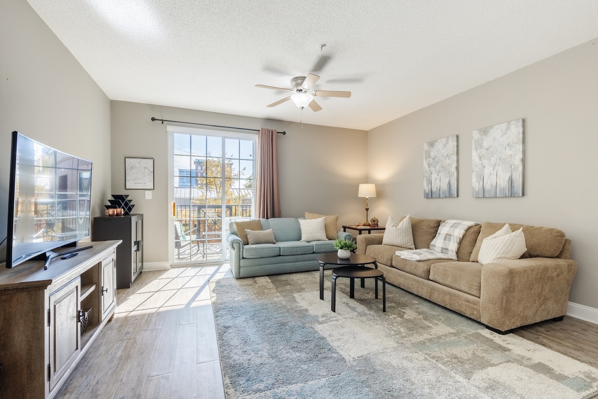 Welcome to this stylish 2-bedroom, 1-bathroom condo in Downtown Greenville! Located across the street from the popular Bon Secours Wellness Arena, this modern rental is perfect for your stay. With contemporary decor and natural light, our condo offers a sophisticated atmosphere. Enjoy restful nights on plush bedding in both bedrooms. The luxurious spa-like bathroom features elegant fixtures and a rejuvenating shower. Explore Greenville's vibrant downtown scene from this prime location.