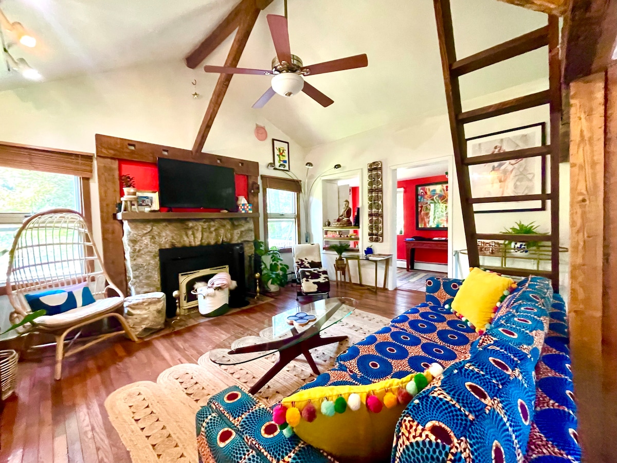 Ultra Chic Cottage set high above Greenwood Lake with Private beach and lake front community access. Minutes away from Mountain Creek Ski Resort, Spa & Water park, Mt. Peter Ski & Tubing, Warwick creameries, breweries & vineyards & apple picking. 1 BR, 1 Bath, play/office/common room. Huge wrap around fenced in deck with Mid century modern fireplace allows for scenic dining, lounging and around the fire gatherings. #LakeViewCottage_GWL Town of Warwick Short Term Rental Permit #33593