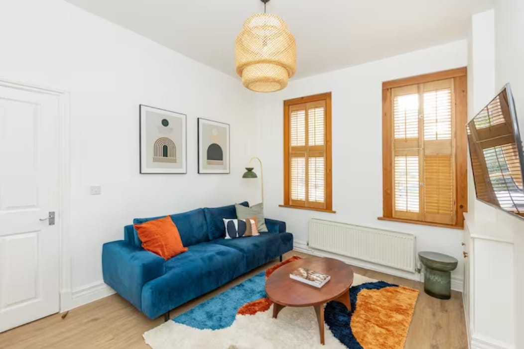 Calm, stylish Clapham home on a quiet residential street, just 5 minutes to Clapham North Tube and Overground trains. Ideal for couples or families of five, with a Super King bedroom plus three single sofa beds so no one has to share. High ceilings, sunny bay window, beautifully designed interiors, full kitchen with marble breakfast bar, strong shower, blackout blinds, hotel-quality linens, fast 100Mb Wi-Fi, and a private terrace with bay trees and BBQ. Free street parking after 5:30pm.