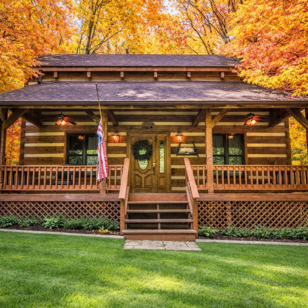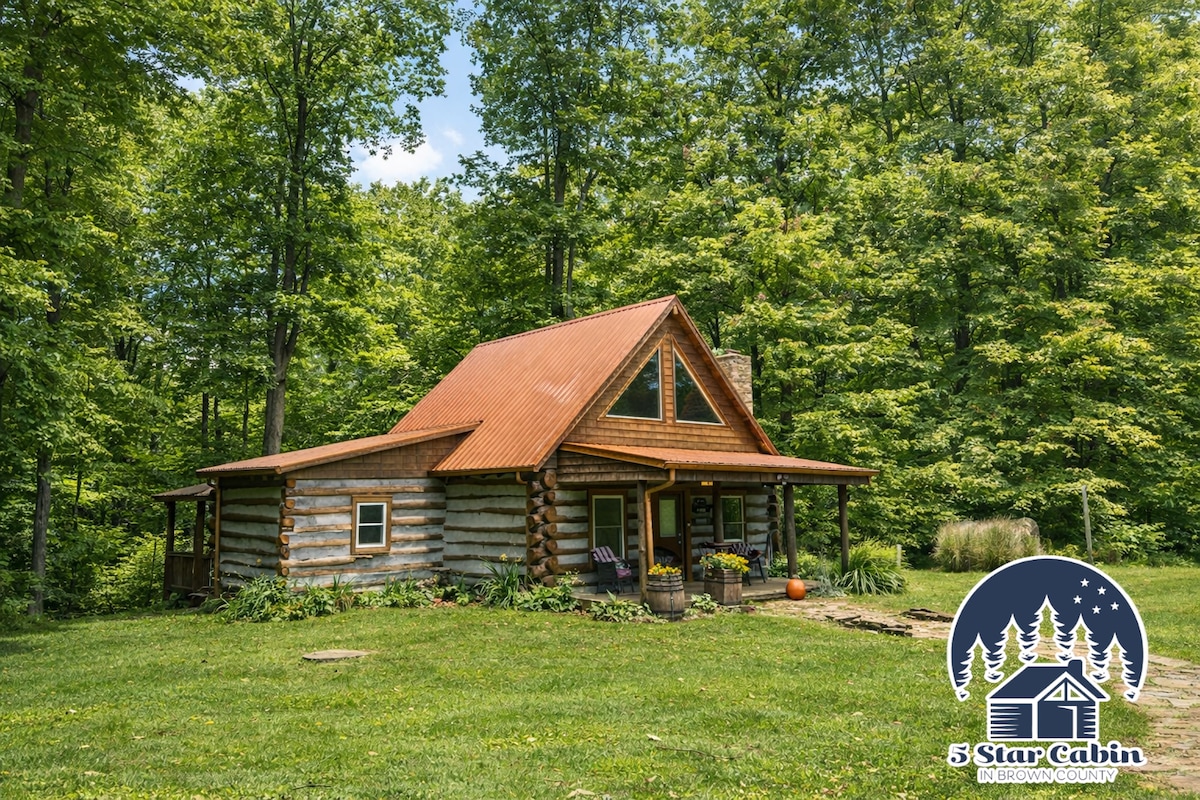 Surrounded by 14 wooded acres in Brown County, 5 Star Cabin offers a peaceful log cabin stay with a private fishing pond, hiking trails, hot tub, suspension bridge, and cozy fireside evenings just minutes from Nashville, Indiana.