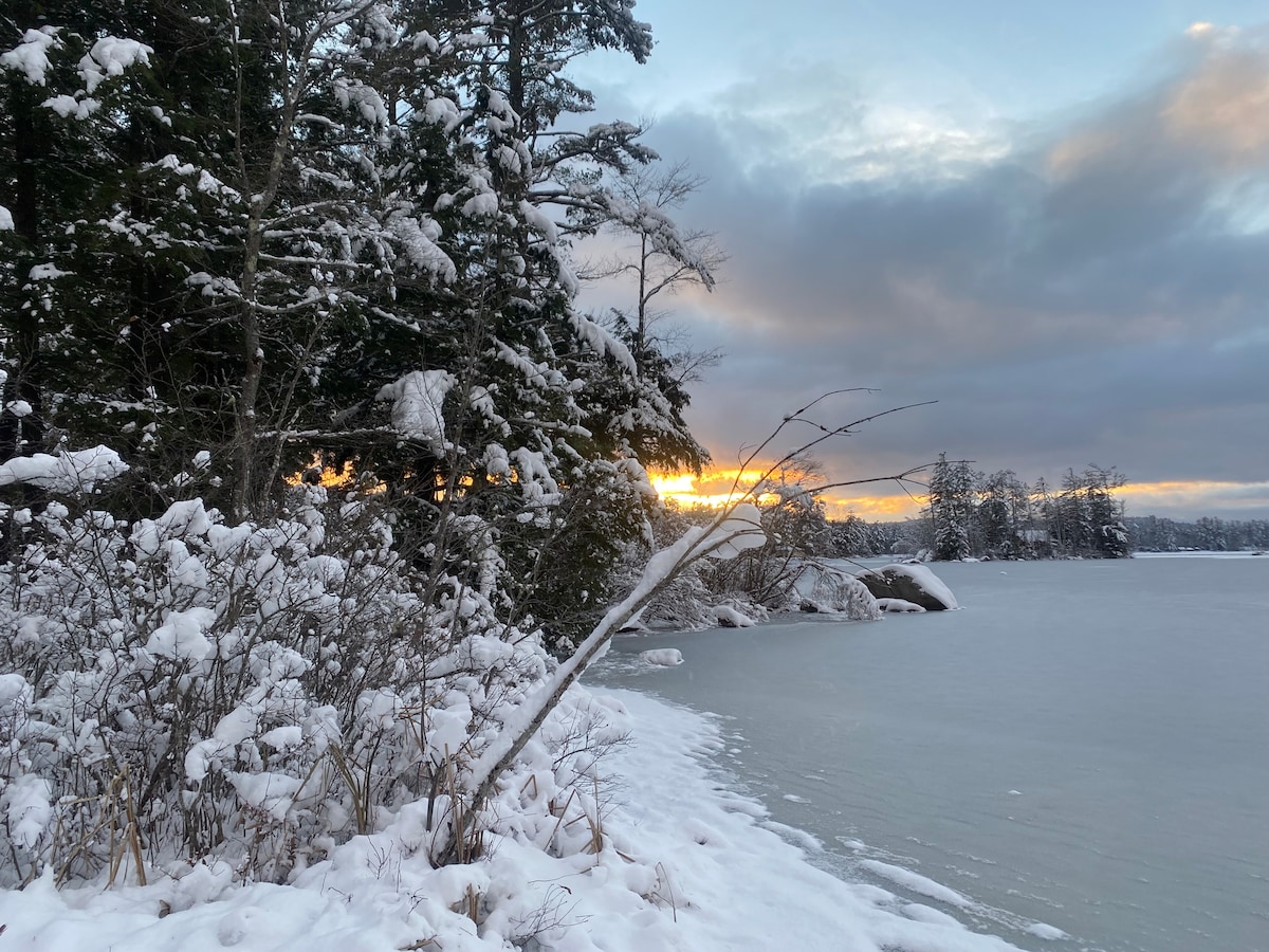 Private waterfront Cabin in woods, nestled off private dirt road near Mt. Abrams and Sunday River. Kayak, swim & fish in pristine lake in Summer. Skate, XC Ski, Ice Fish, Snowshoe, Hike in Winter. Fireplace and Fire Pit. Excellent wifi - Private, quiet remote workspace. Rustic modern cozy decor: fully-equipped stainless steel kitchen with full sized appliances, dishes, utensils, coffee maker. Organic linens. Pristine bathroom-large hot shower area, heat lamp, jetted soaking tub.