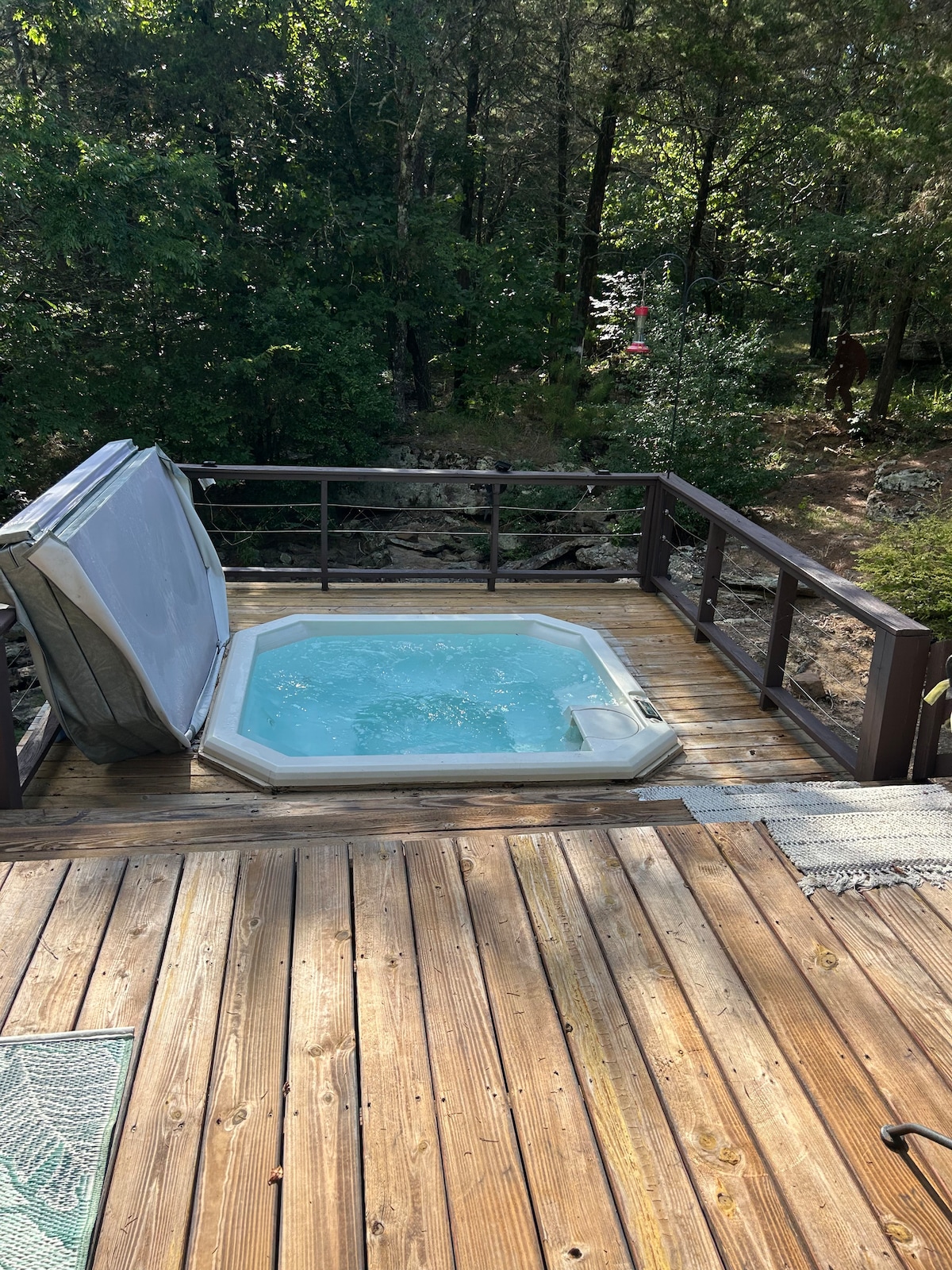 Crockett's escape treehouse is an amazing lodging experience with a 180- degree view of beautiful Greers Ferry Lake. The private woodland retreat for two adults features a two-person jacuzzi hot tub that allows you to look over the entire lake. The treehouse has a full kitchenette with a stove top oven, microwave, dining area, Fireplace with a 65-inch smart TV. The L shape sectional couch with chaise turns into a sleeper. The private wrap around deck is huge and the views are spectacular