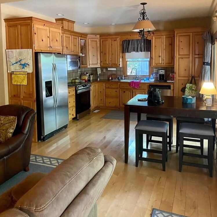 Our charming mountain-modern waterfront lakehouse is perched atop a bluff near a beautiful wedding venue. A public boat launch is just 1 min away, and the jumping cliffs in Snakehead Cove are a short/bike/ATV ride. Enjoy guest passes to amenities like pickleball/tennis courts, 3 pools, bowling alley, Hart Health Center w/indoor pool, mini golf, Mountain Ranch & Indian Hills Golf Course. 90 miles of ATV/UTV trails. Jannsen’s Lakefront 15 min away, and…THE LAKE! ⚠️ Many amenities are seasonal ⚠️
