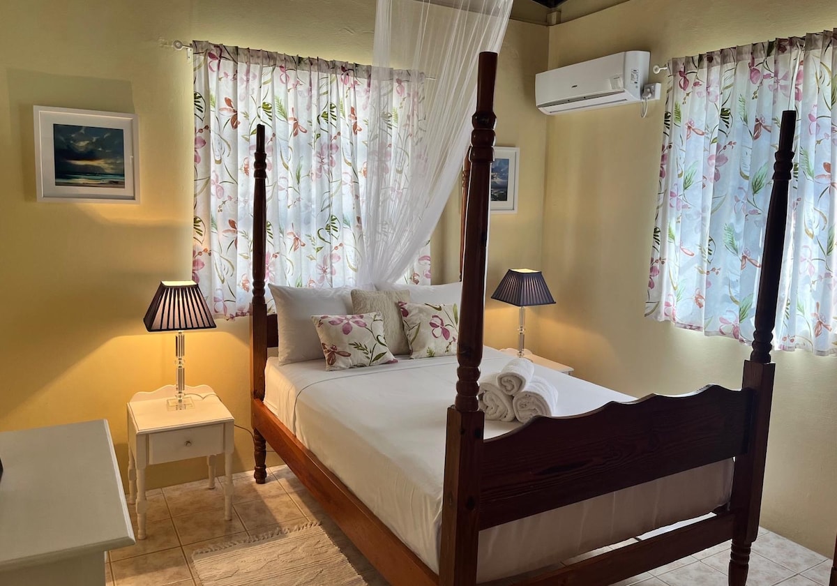 Mango Nook is an open plan and fully air-conditioned cottage. It is set in a lush tropical garden with flowers and fruit trees including mango, papaya, plumrose and lime. Mango Nook is in a quiet old fishing and former whaling neighbourhood and is two minutes from a sandy beach. The cottage is centrally located within minutes to local restaurants and bars, within easy walking distance to the main town of Port Elizabeth, Belmont Walkway, so a rental car is not necessary.