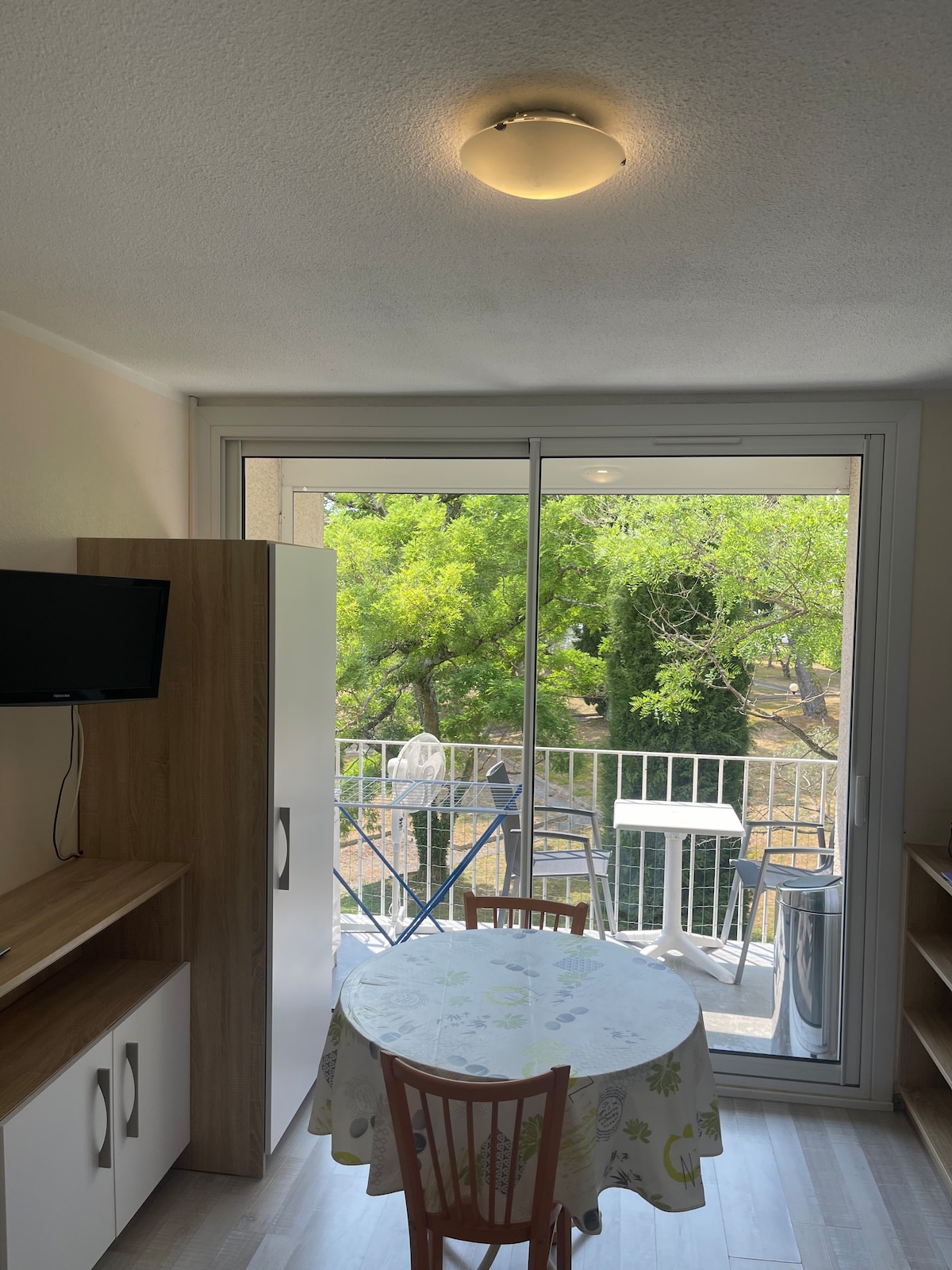 attention linge non fourni Résidence dans un joli parc arboré. Loue studio classé 2 étoiles 17m2 équipé pour 2 personnes, RDC surélevé, exposé ouest, balcon 4m2 vue sur le parc, baie coulissante double vitrage, volet roulant électrique et store. Coin nuit literie en 140–écran plat TNT- Cuisine équipée - Salle de bains avec douche, sèche cheveux –wc– machine à laver - planche et fer à repasser Résidence sécurisée Parking et wifi gratuit Local à vélo sécurisé