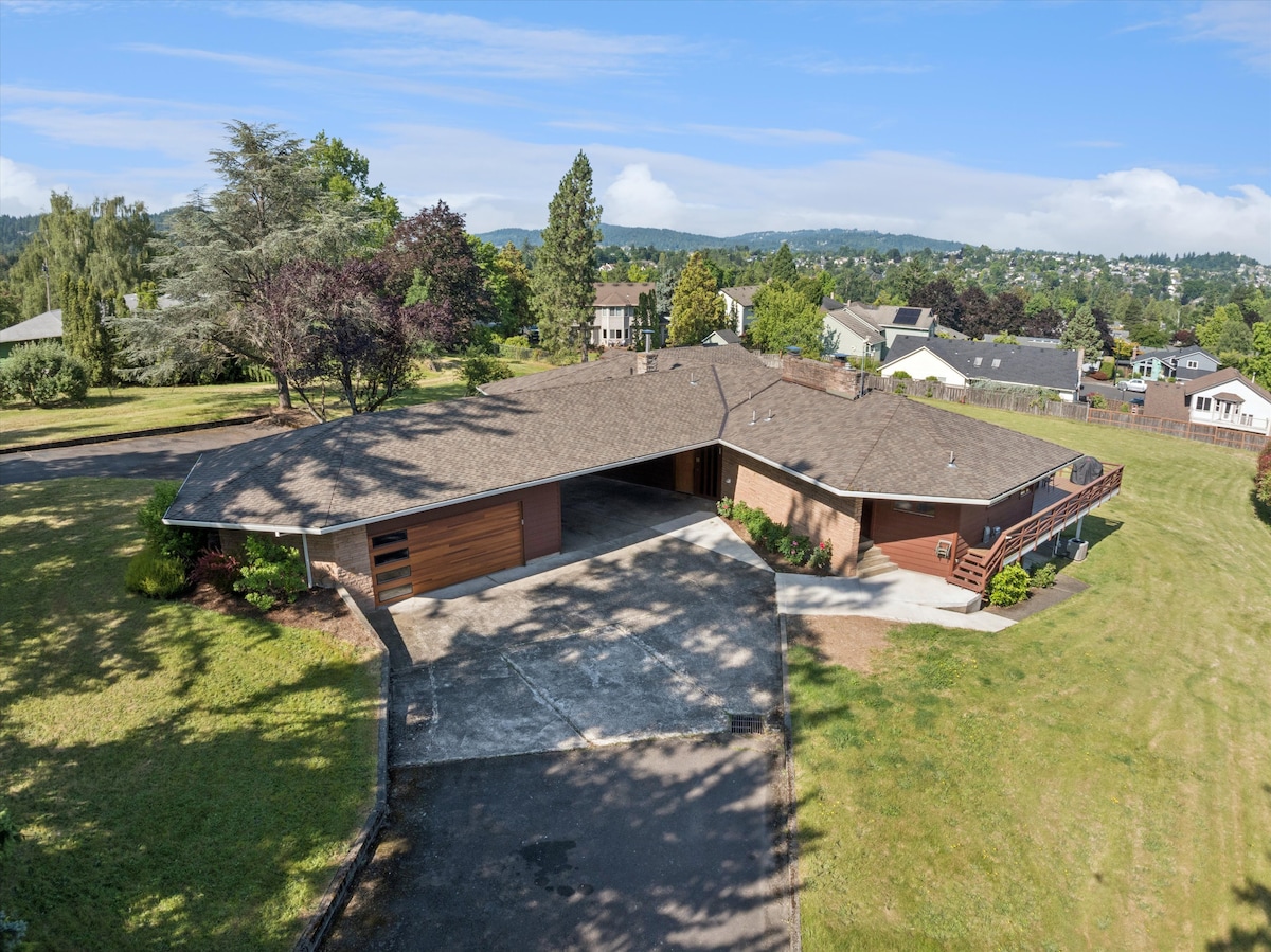 Escape to our mountain luxury home nestled on 20 wooded acres w/ wild life. Enjoy 2000 sqft in a secluded setting with full views of Mt. Hood. Private 2500 sqft covered patio w/ BBQ. Kitchen and dining that flows through a moveable window wall for indoor/outdoor living. Media room with powered reclining seats w/ tiered theater seating. Laundry. 10 minutes to dining, entertainment, or shopping. 45 minutes to Mt. Hood recreation (skiing, hiking, kayaking). Sofa bed in mediaroom. Bunk bed avail