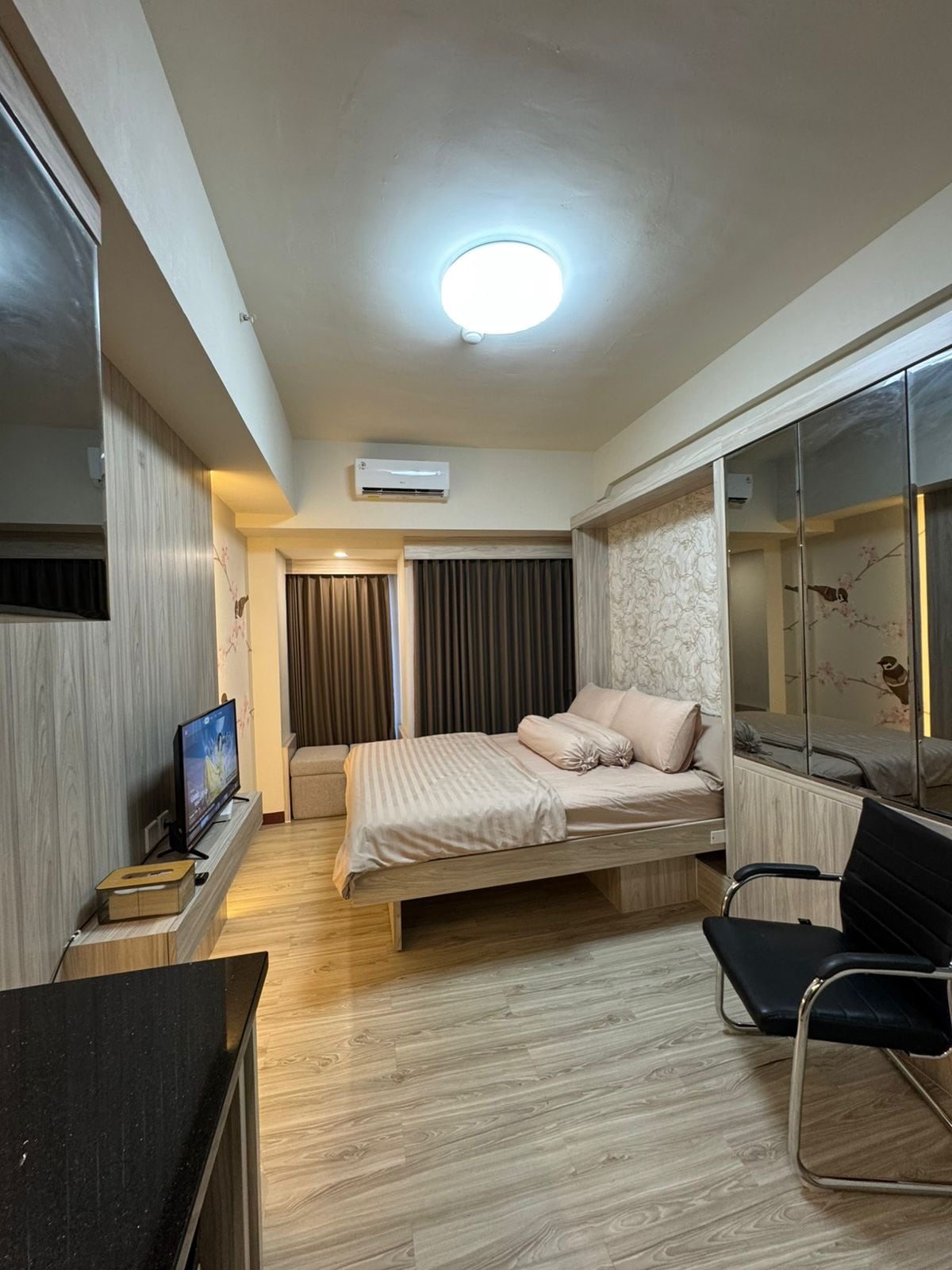 The Paneya @Benson Apartment featuring the largest studio room at Benson Tower.Modern simple luxurious accommodation in convenient location above Surabaya Pakuwon Mall. The biggest mall in Indonesia. It has direct access to Pakuwon Mall. Offer exceptional green scenery during the day and beautiful city light of West Surabaya at night. Equipped with 2 queen size bed(1pull out bed),kitchen utensils, smart TV,private bathroom,hair dryer, fridge and kettle. Free WIFI and Netflix are also available