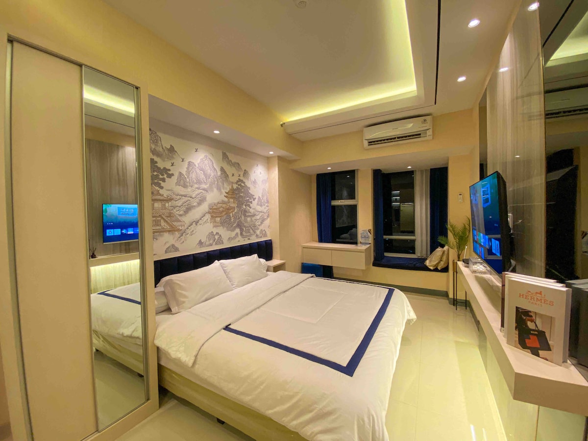 Hello, welcome to La Casa I Waking up in the morning with the great view from 61.5 feet above Pakuwon Mall This place is located in the heart of West Surabaya’s & connected directly with the biggest and most prestigious mall in Surabaya, Pakuwon Mall. Imagine how you can spend your time with watching netflix, lie down in a king size standard bed, luxury room, with the warm comfortable blanket & beatiful ambience lights. Last but not least, the high speed internet. You really on vacation!
