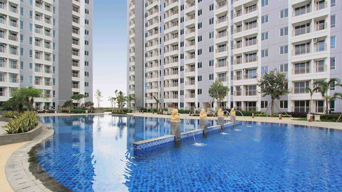 Studio Apartment in Pakuwon Mall with cozy & modern decoration. - Connected with shopping mall (Pakuwon Mall the bigest shopping mall at Surabaya), restaurant, supermarket/groceries, branded store, cinema, children playground, karaoke, foodcourt, etc. - Full access Wifi, Smart TV, Netflix (using your own account) -Electric/induction stove, cooking equipment, mini rice cooker, electric kettle and tableware.
