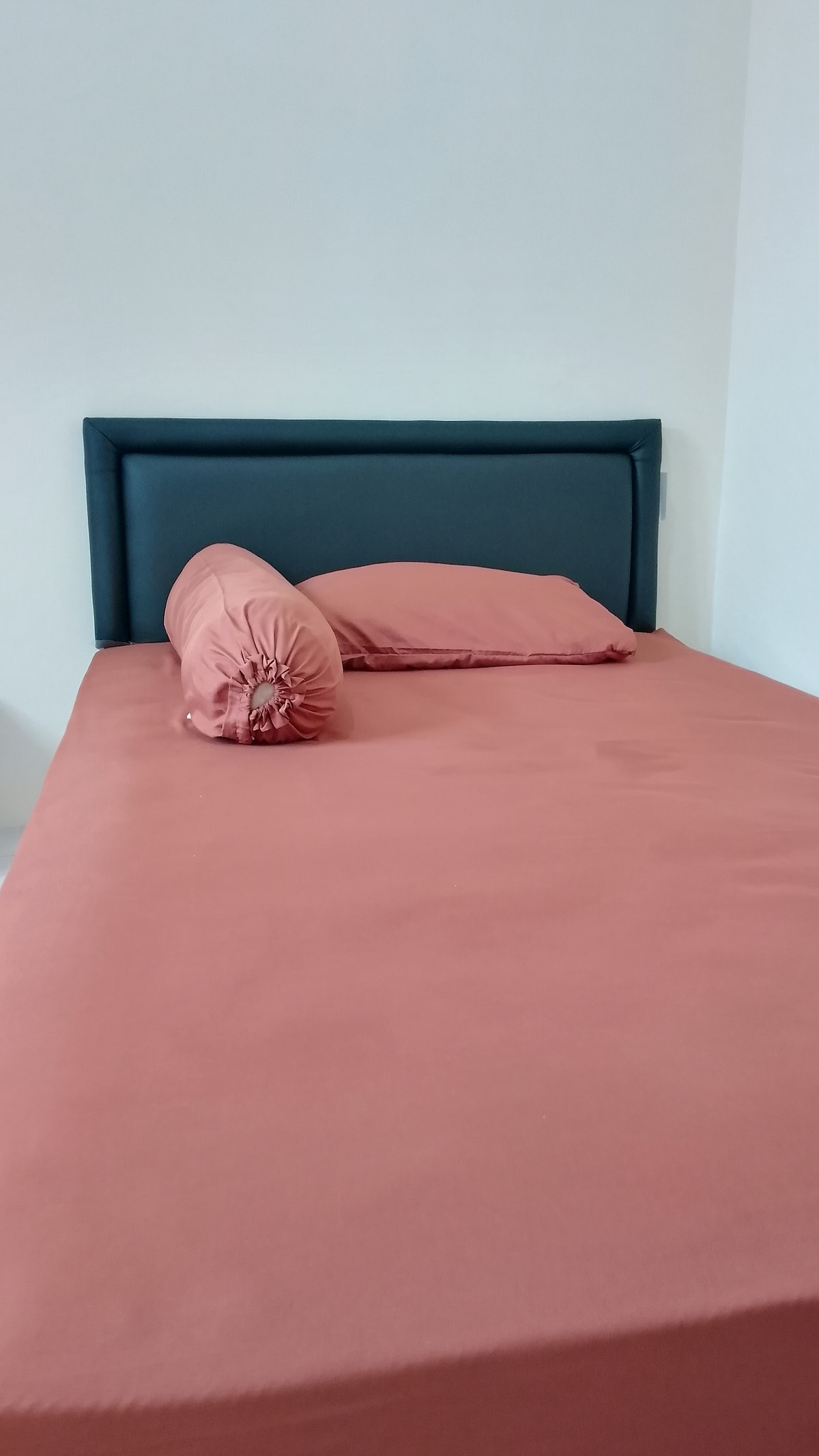 Enjoy a comfortable stay in this modern and minimalist room, perfect for solo travelers or couples. The room features a comfy double bed with fresh white linens, warm wooden flooring, and calming teal walls that create a relaxing atmosphere. A private ensuite bathroom is included, equipped with a toilet, wash basin, and mirror, ensuring convenience and privacy. The bathroom is clean, tiled, and fitted with essential amenities.
