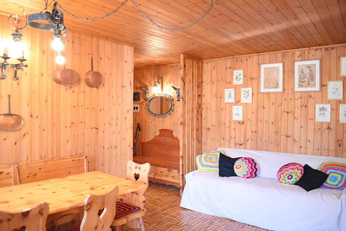 Alps Mountains. Italy. Aosta Valley. A cabin in a small village at 1600 meters,in the peace of meadows, grazing cows and mountains. Snow (usually) in the winter. A place of the heart, lovingly restored preserving the ancient beams of the roof. A wonderful view from the large windows and a special tranquility for those in search of peace, warmth and relaxation. The furniture is very nice: wood above all, but also more lively colors, and modern comforts. Quiet excursions, both on snowshoes or ski.