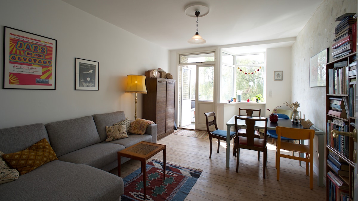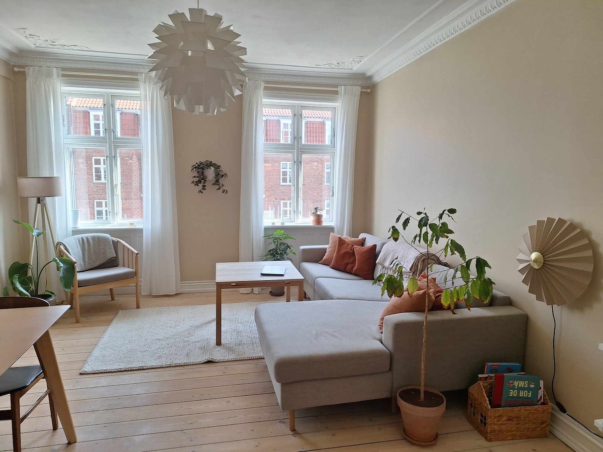 The apartment is in the best place in Roskilde. Close to the street with shops, close to parks with green areas and a walk to the harbour, where you can swim. The apartment is lovely, neat and clean, located on the 1st floor with a French balcony overlooking a quiet courtyard. The apartment contains a hallway, kitchen with fridge/freezer, dishwasher and oven. A bedroom with a double bed. Living room with dining area, TV and a sofa bed for 2 people. The last room is locked off, may not be used.