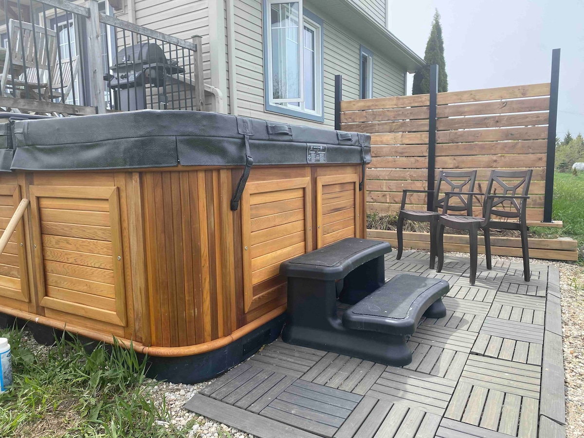 A real gem! Warm & inviting, our 3 bdrm chalet comfortably sleeps 8 & offers an upscale setting for your special Blue Mountain getaway. Decorated with a mix of vintage & modern to provide the very best comfort, we offer a 6 person Hottub on our south facing upper deck, Gourmet Kitchen, Spa Bathroom, 3 Smart TVs, WiFi, Laundry, Propane BBQ, & so much more. Come with families, friends, or just the 2 of you, to relax & put your feet up. In the country yet 2 minutes from town. You'll love it!
