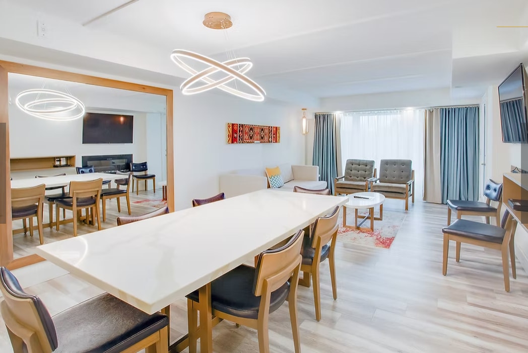 This one-bedroom suite sleeps four, featuring a luxurious king-sized bed with a jacuzzi tub, and a queen-sized pullout couch in the living area. Along with a separate full bathroom, the suite boasts a fully equipped kitchen and a private balcony. The ski slopes are just a short stroll through the village, or you can hop on the resort’s shuttle for quick access. The village itself offers an array of shops and dining experiences, après-ski options, and many of family-friendly activities