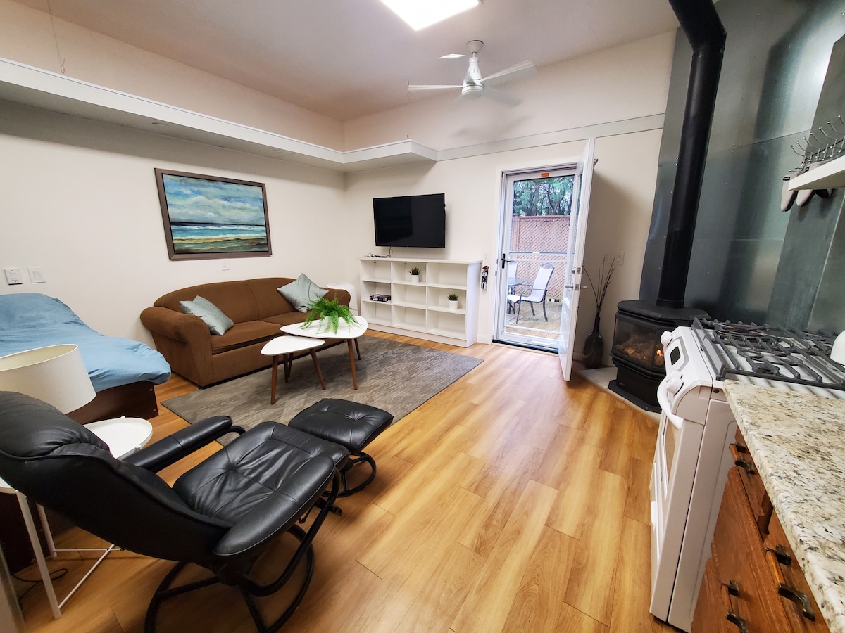Perfect for a getaway in the country. A bright, spacious, open-concept designer studio featuring beautiful rolling-hill vistas, queen bed, 3-piece bathroom, dedicated bbq, heat/AC plus a wood burning stove, wet bar with a Nespresso machine, deluxe counter-top oven & bar fridge and all new tennis court, laundry available upon request. Mono Cliffs, Boyne Valley, Hockley Valley Nature Reserve Prov. Parks & Mansfield Recreation Centre are minutes away. Ideal hiking, cycling, snowshoeing and xcsking.