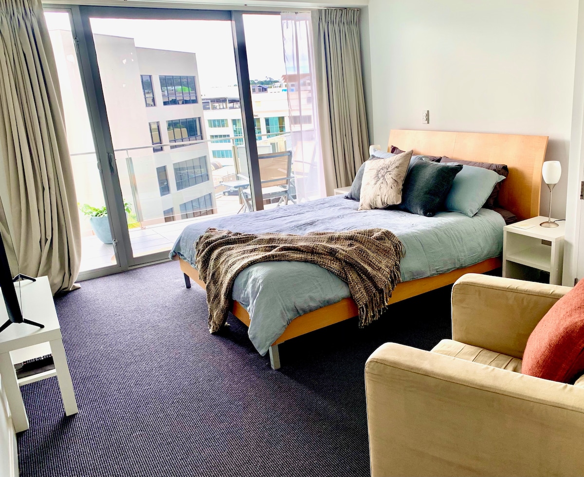 Modern designed & stunning studio with incredible city views on Queen St next to Myers Park! Enjoy your stay with access to the building's indoor gym & outdoor pool, comfy queen-size bed, open plan dining & living area, a double-glazed floor-to-ceiling window that gives you maximum sunshine. Settle in with a fully equipped kitchen & laundry, unlimited WiFi, smart TV, everything you need is on your doorstep. It is an easy walk to Skytower, ferry, train station, university, Bar & Restaurant.