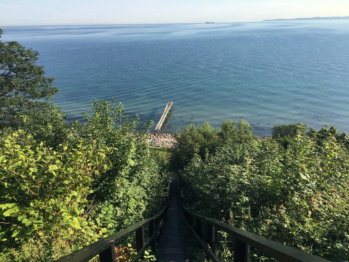 Gården ligger knap 100 meter fra vandet, og der er bare 500 meter til trappen ned til stranden. Det er en separat lejlighed med egen indgang. Lejligheden er dejlig rummelig på 100 M² og består af et køkken/alrum, to store soveværelser og et badeværelse. Der er en lille privat gårdhave, og derudover er der adgang til en stor parklignende have med gamle frugttræer. På gården er der også et glaspusteri, og man er altid meget velkommen til at se, de fine ting som er lavet her.