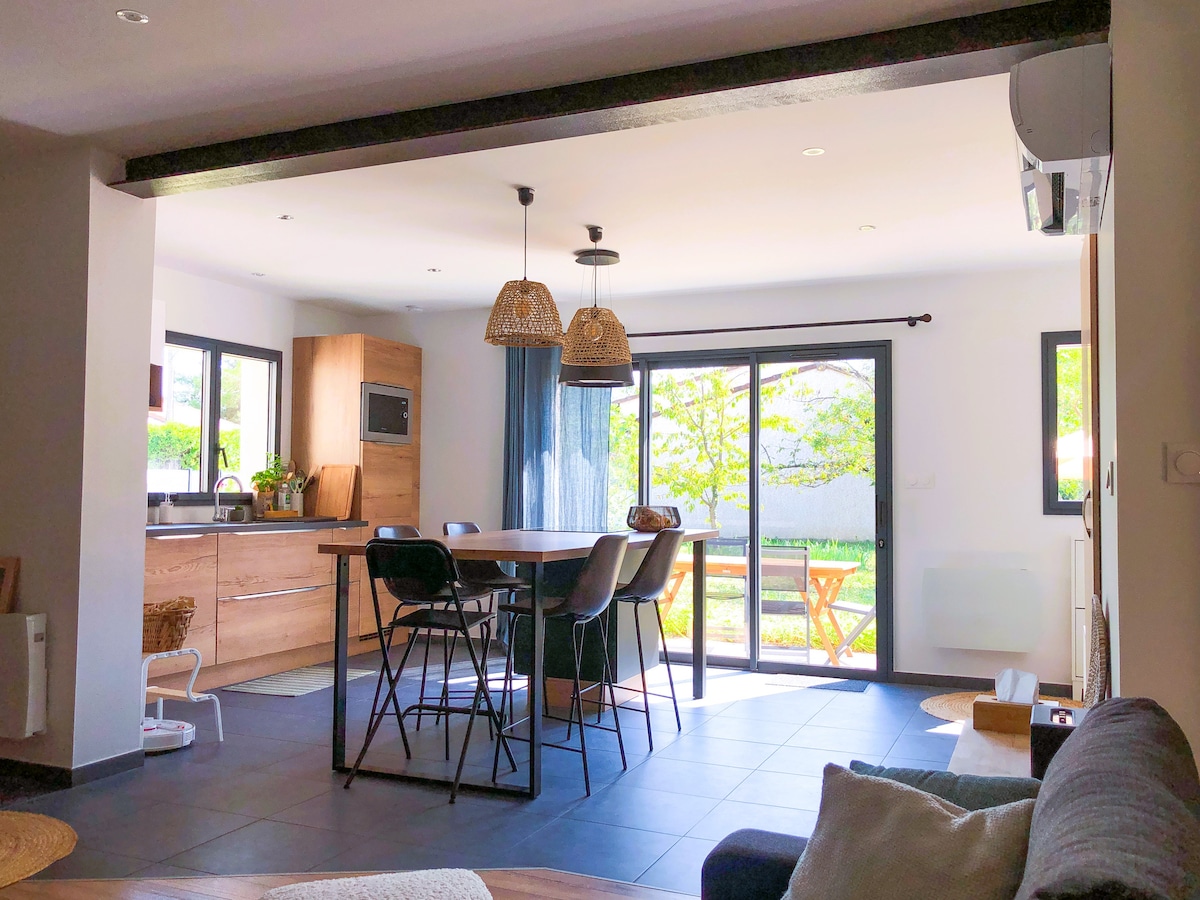 La Remise où mon grand père rangeait son tracteur a été rénovée en une maison individuelle de 90m2. 🌱Jardin clôt 110m2 🌊mini piscine sécurisée 🚲🏍️Garage sécurisé Une spacieuse pièce de vie de 7m sous plafond, cuisine équipée, salon & mezzanine avec 2 lits simples. Chambre 1 : lit Queen size + balcon avec table & chaises. Chambre 2: 2 lits simples. Salle de bain & toilettes séparées. La maison est classée 2 ⭐⭐ en logement de tourisme 4G en partage de données pour le télétravail