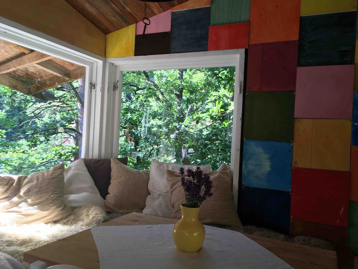Small playhuose/minihouse drawn by our family architect - quiet glamping place at the edge of the forest near city centre. Lovely and creative for little kids, adults have to bend to get in the small door... Close to city centre, 2 km. Late check in possible, proximity to ferry terminal. It’s really small and you need to be able to climb a little to get access. The toilet is in the main house and it’s simple standard with mattresses. Bring your own sleeping bag/sheets or rent for 50kr pr set.