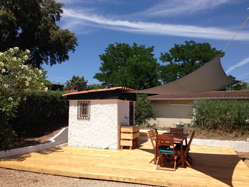 Chalet dans propriété des hôtes avec piscine et jacuzzi, situé à 800 mètres de la gare de St-Raphael et de ses plages. Il comprend: 2 pièces (3 couchages) , WC séparé, salle d'eau avec douche italienne (sèche cheveux ), une cuisine extérieure (plaques de cuisson, réfrigérateur, petit congélateur, micro-ondes, machine à laver, cafetière (senséo), plancha. Aspirateur Logement pour des personnes calmes. Invités refusés Possibilité: lit bébé Les propriétaires ont un chien cocker et un chat