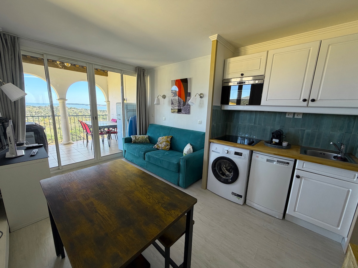 En plein cœur du Golfe de St-Tropez, appartement vue mer, dans une résidence de vacances aux Marines de Gassin. Une ambiance cosy tropézienne, avec sa terrasse lounge. Vous pourrez profiter d’une plage de sable fin et également d’une piscine lagon privée, à 2 mn à pieds. T2 traversant de 35m2 dont 8m2 de terrasse, avec lit Queen size, chauffeuse ( pour éventuellement une 3 ème personne, rénové avec goût, climatisé, au 2 éme étage, ascenseur, clim, wifi…
