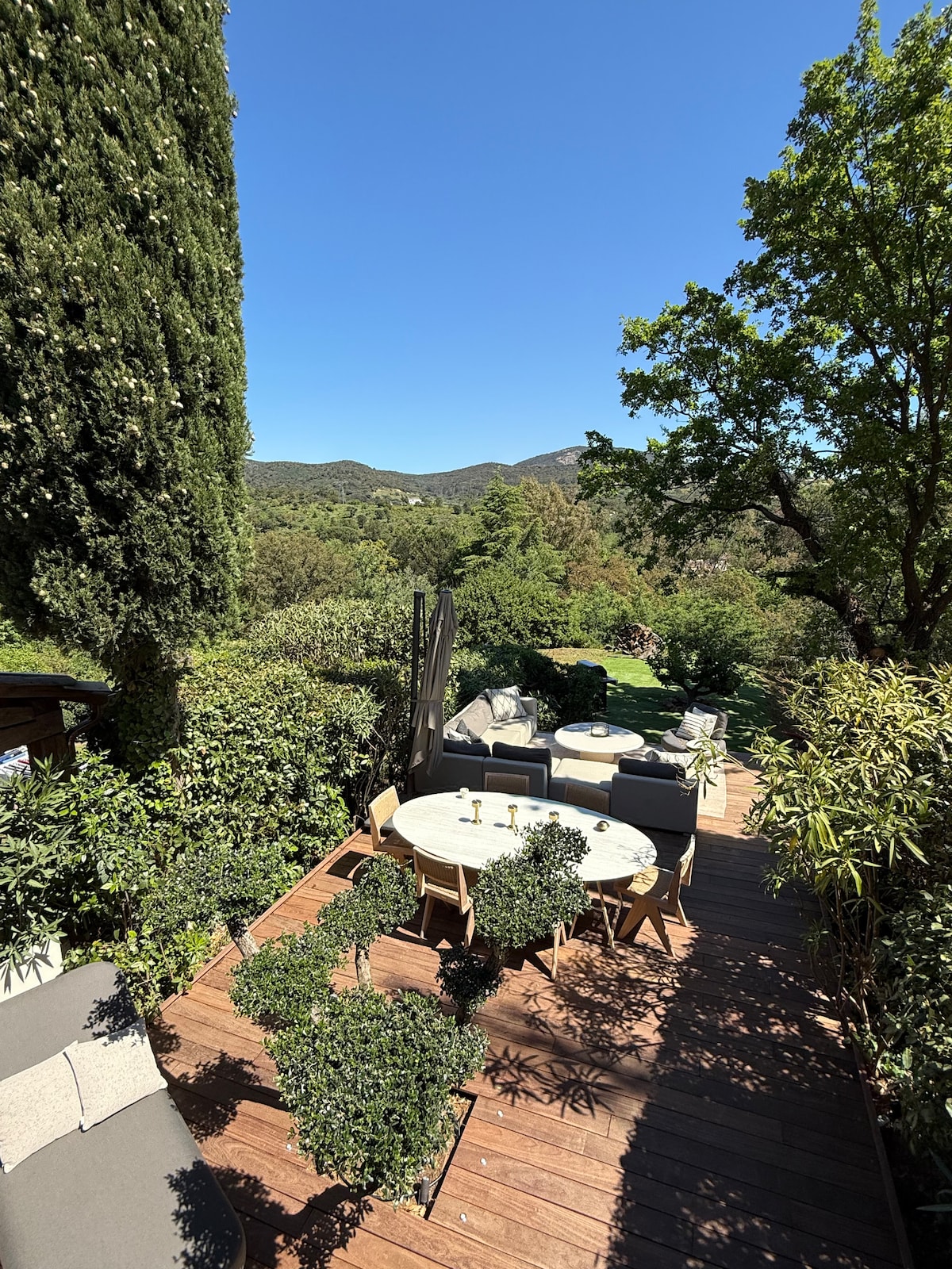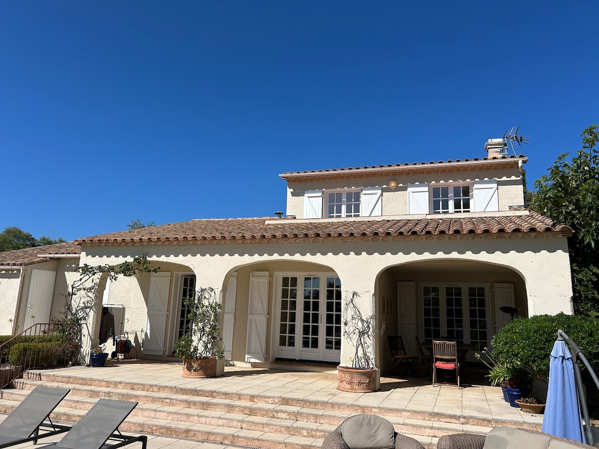 dans le golfe de st tropez à grimaud, magnifique villa nichée dans un écrin de verdure . Vous profiterez d'un jardin de 2200 m², d'une piscine privée, d'un terrain de pétanque, d' une salle zen et de grandes terrasses aménagées. La villa décorée avec goût est entièrement climatisée. elle se compose : . 1 cuisine équipée ouverte sur séjour salle à manger de 100m² . 4 chambres ( 3 lits de 160 et 1 de 180cm ) . 3 salles de bain dont 1 avec baignoire . 1 bureau La villa bénéficie du calme absolu