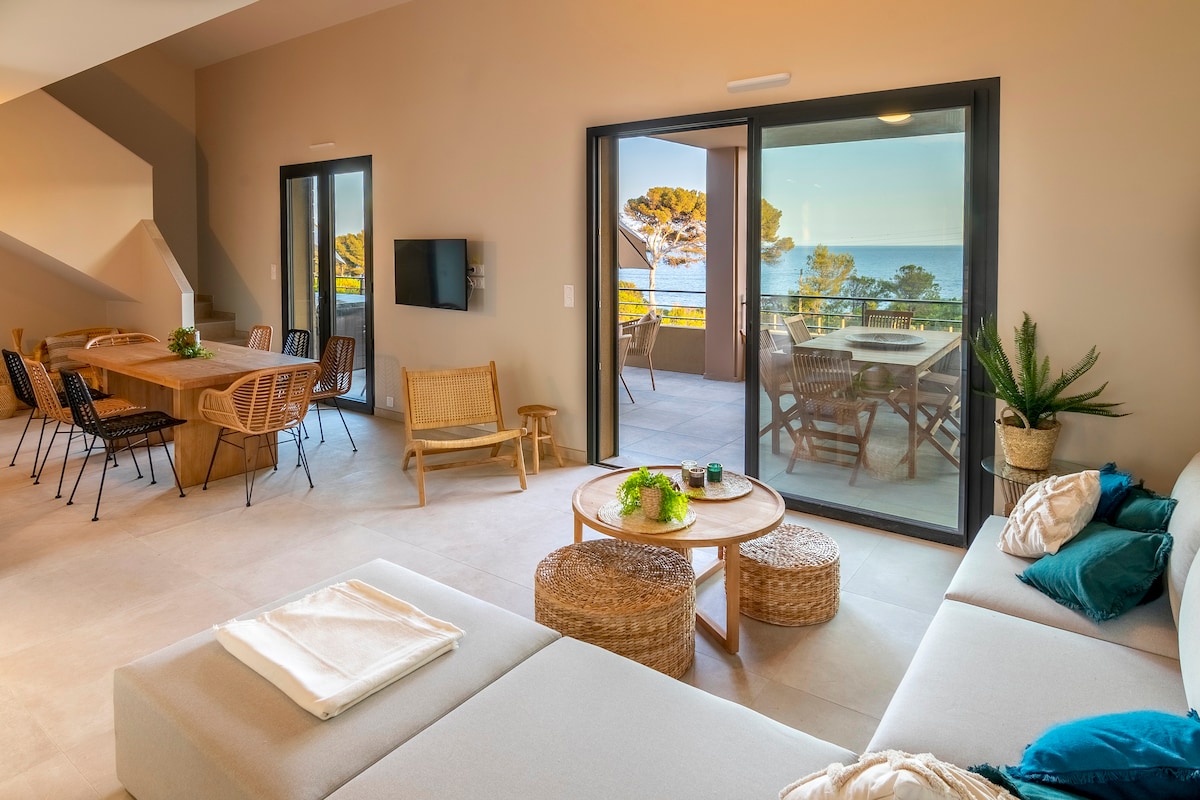Logement Entier: appartement rez de jardin avec terrasse en bois vue sur la mer et les pins parasols et une place de parking au cœur de Gigaro dans une résidence sécurisé. L’exposition Sud Ouest vous permettra de profiter du soleil toute la journée et du coucher du soleil. L’accès à la plage est à 7 minutes à pied. L’appartement contient un lit et un canapé lit, une cuisine, une salle de bain et d’un toilette séparé