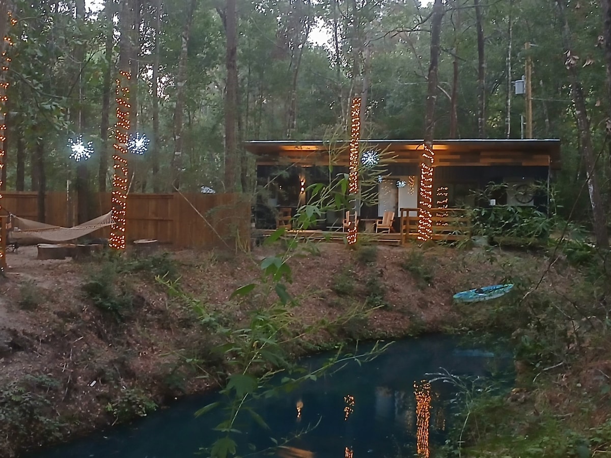 Close to Texas A&M College Station and just north of the Woodlands, but away from the hustle and bustle; is a completely brand new one bed cabin nestled on 40 acres. Luxury bedding and kitchen appliances. Enjoy watching the deer, birds, cows and other wildlife. Sit on the front porch relaxing or start the fire pit and grill your favorite dishes on the charcoal grill gazing at the milky way. We can also organize birding tours for an additional fee. Note property is on 6 miles dirt roads