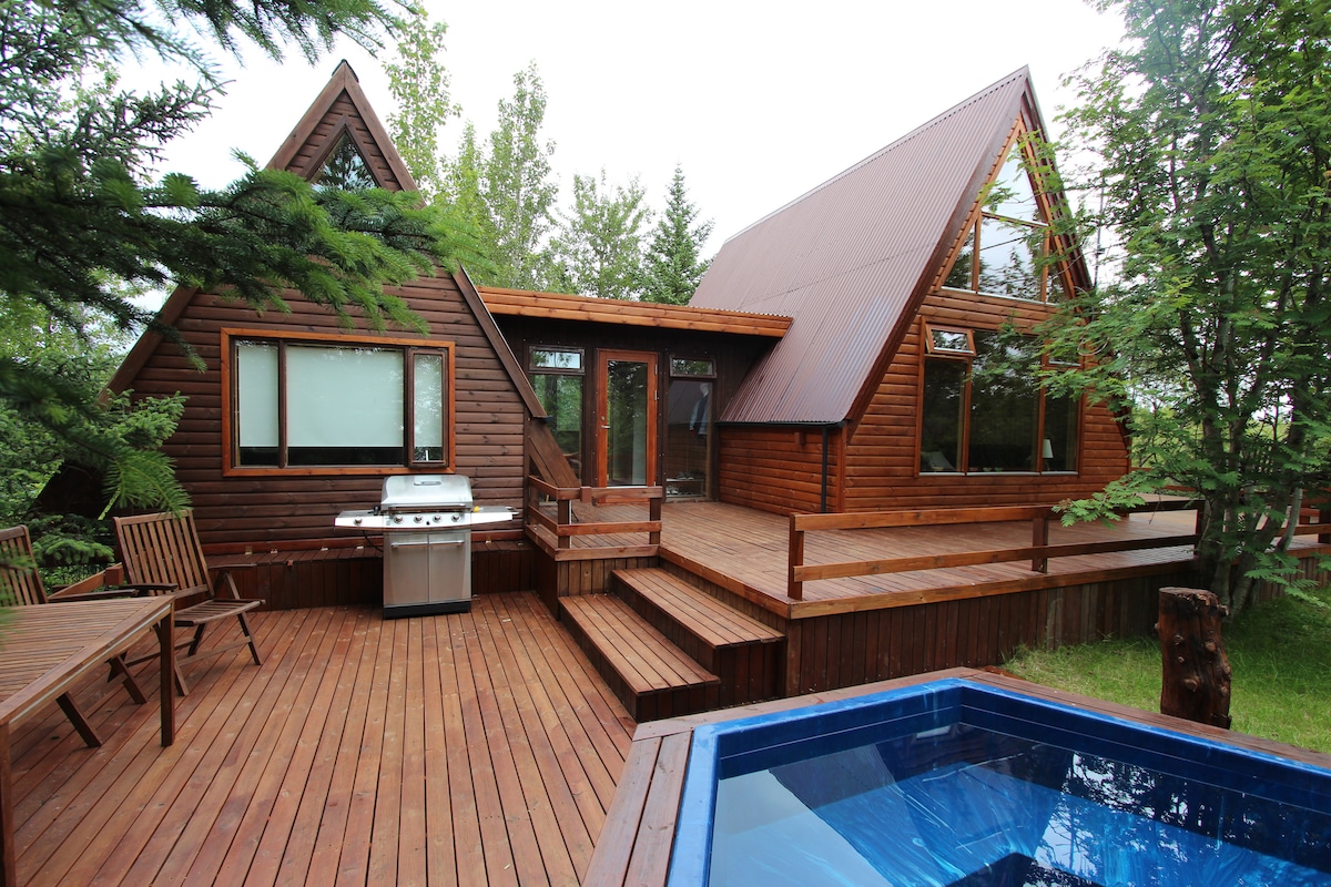 2400 sqf wonderful cosy cabin in beautiful surroundings located in the Golden circle - in a gated area ca 50 minute drive from Reykjavik. The cabin is super clean and offers all the necessary amenities to have an enjoyable stay. 4 bedrooms, 6 beds. Fully equipped kitchen with fridge/freezer, stove/oven, Nespresso machine. Tv and pool table in the second floor living area. Free wifi. Two full bathrooms with showers. Deck fully fenced. Hot tub, outside seating and BBQ. Free EV Charger.
