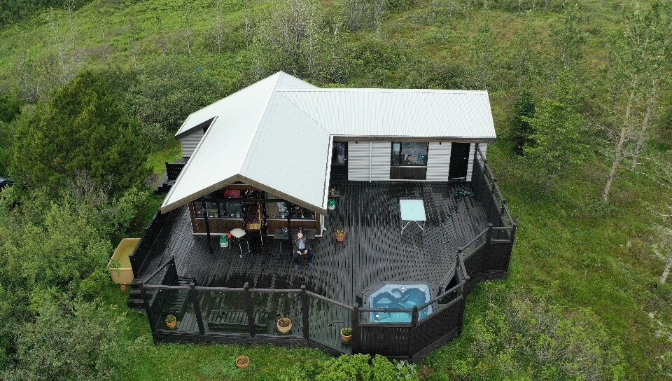 2400 sqf wonderful cosy cabin in beautiful surroundings located in the Golden circle - in a gated area ca 50 minute drive from Reykjavik. The cabin is super clean and offers all the necessary amenities to have an enjoyable stay. 4 bedrooms, 6 beds. Fully equipped kitchen with fridge/freezer, stove/oven, Nespresso machine. Tv and pool table in the second floor living area. Free wifi. Two full bathrooms with showers. Deck fully fenced. Hot tub, outside seating and BBQ. Free EV Charger.