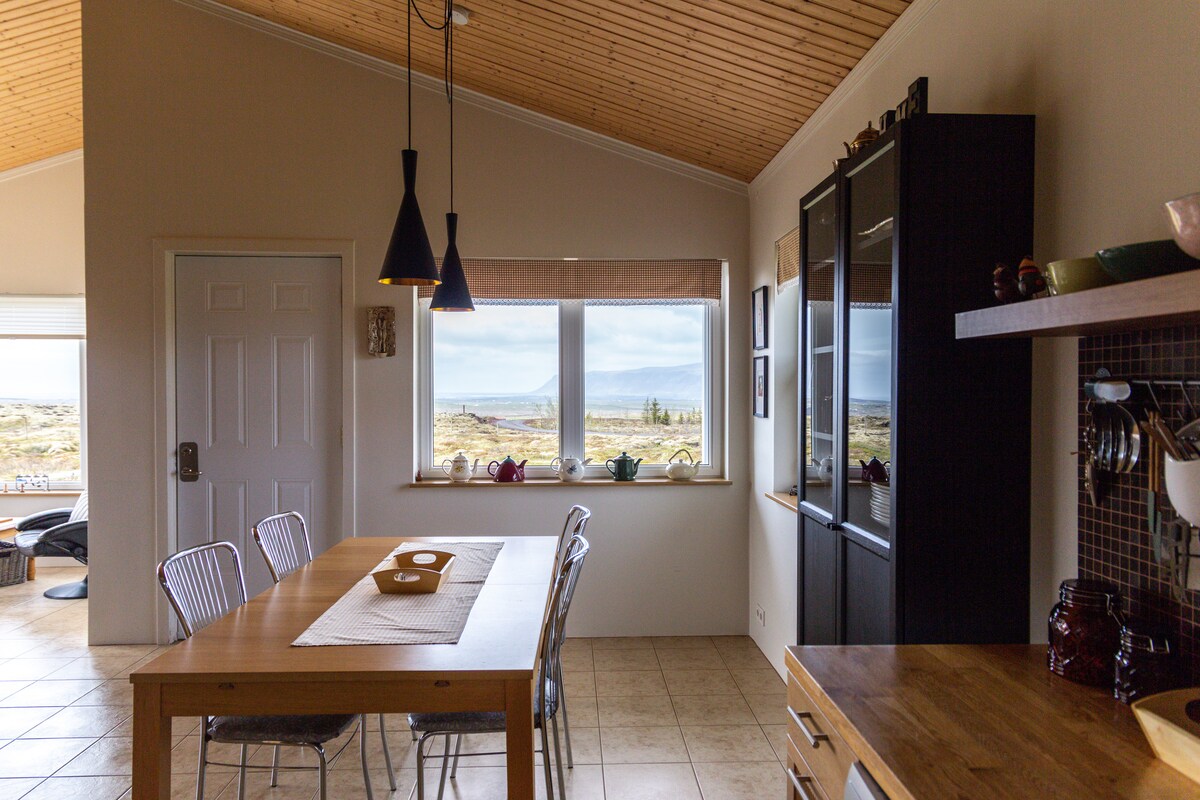 This getaway is very unique and secluded. It has spectacular panorama mountain view over two of Iceland's most famous volcanos and fantastic northern lights sightings. The house is cozy with lots of windows for enjoying the view. Sleeping space for 4 people, a comfortable full size bed and a luxury sofa bed. This place has a lot of character and Icelandic artwork on the walls also powerful wi-fi and a smart tv. Private washing room with washer and dryer.