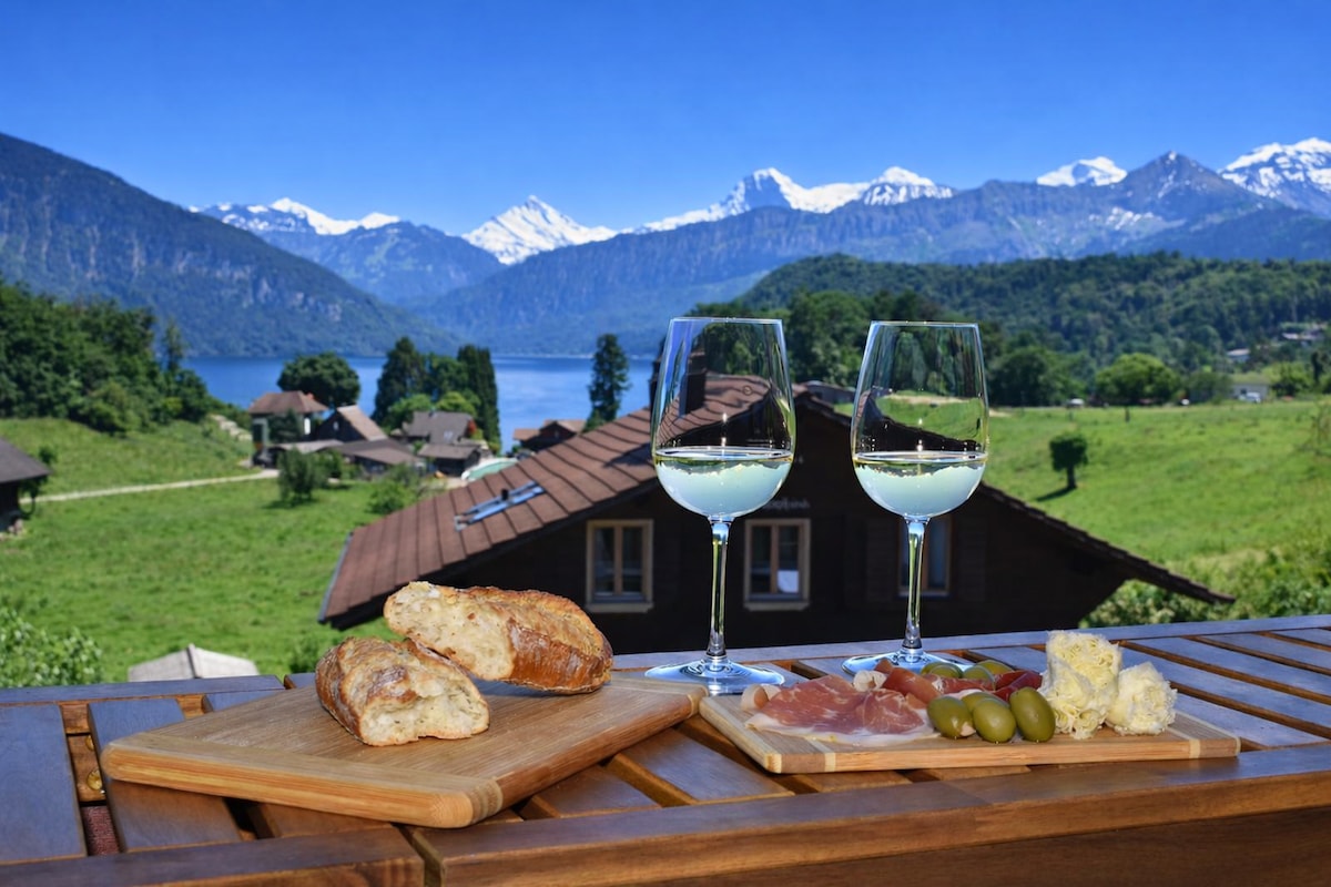 Looking for a magical stay in the Swiss Alps? Welcome to SUNGALOW, where timeless elegance meets modern comfort. Newly renovated in 2024, enjoy a fully equipped gourmet kitchen, stylish living spaces, and wraparound balcony with views of Lake Thun & the Eiger, Mönch, and Jungfrau mountains. Located 10 meters from the bus stop to Interlaken and Beatenberg Station. Family-friendly with a kids' park outside, hiking trails, and a shared BBQ space. Free private covered parking, a smart TV & Wi-Fi.
