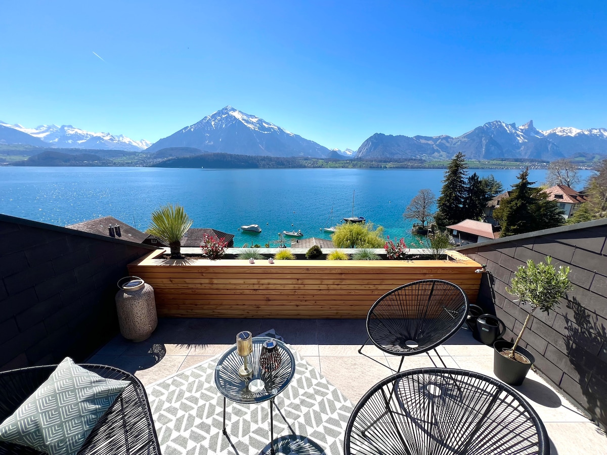 Private suite on the top of the owners’ inhabited villa with lake access and unique views of the Alps. Most highlights can be reached in less than 1 hr. Layout: spacious bedroom (with home cinema), attached panorama lounge, large kitchen, bathroom - all privately used. For occupancy of 3-5 people another private bedroom/bathroom (floor below, access by lift) is provided. Access to lake and garden. Free parking/wifi. Children are possible, small dogs only. The most popular Airbnb in Switzerland.