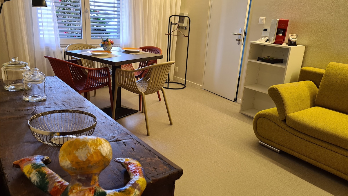 Schönes Studio mit eigenem Sitzplatz an ruhiger Lage nähe Golfplatz, Tennis,Thermalbad/Spa und Rhein. Das Studio befindet sich im Sous-Parterre des Wohnhauses der Gastgeberfamilie und bietet vollkommene Privatsphäre. Ideal geeignet für 2 Personen evt. mit Kind. Gratis Parkplatz vorhanden. Gute Ausgangslage zum Wandern, Biken und Skifahren. Cute studio with its own terrace, close to Golf courses, Tennis, thermal bath & Rhein river. Ideal location to go hiking, biking and skiing.