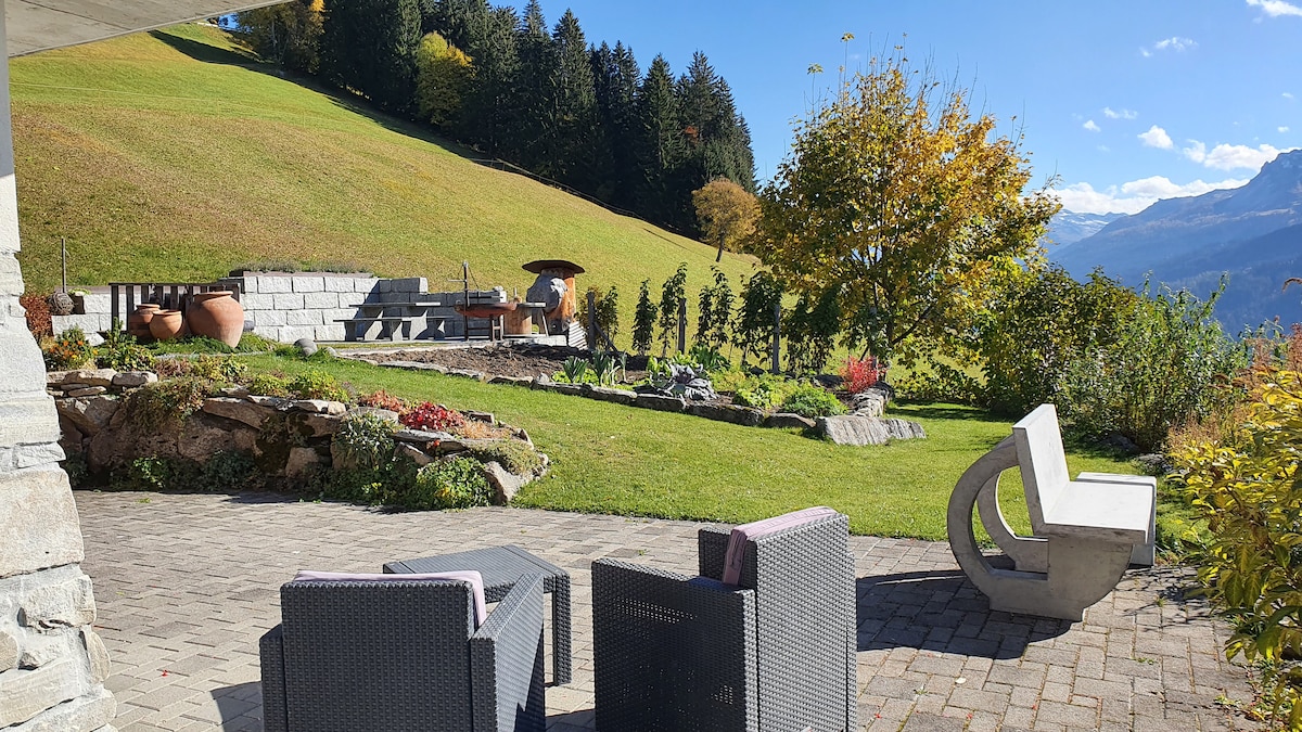 Gemütliche, ruhige 3.5 Zimmer Wohnung mit einzigartiger Aussicht mitten in der Natur. Die Wohnung befindet sich in einem wunderschönen Haus ausserhalb von Pany. Hier könnt ihr euch in absoluter Ruhe in der Bergwelt entspannen und richtig abschalten. Die Wohnung verfügt über zwei separate Schlafzimmer und eignet sich damit bestens für Familien. Wlan ist vorhanden und damit auch Homeoffice aus den Bergen möglich.