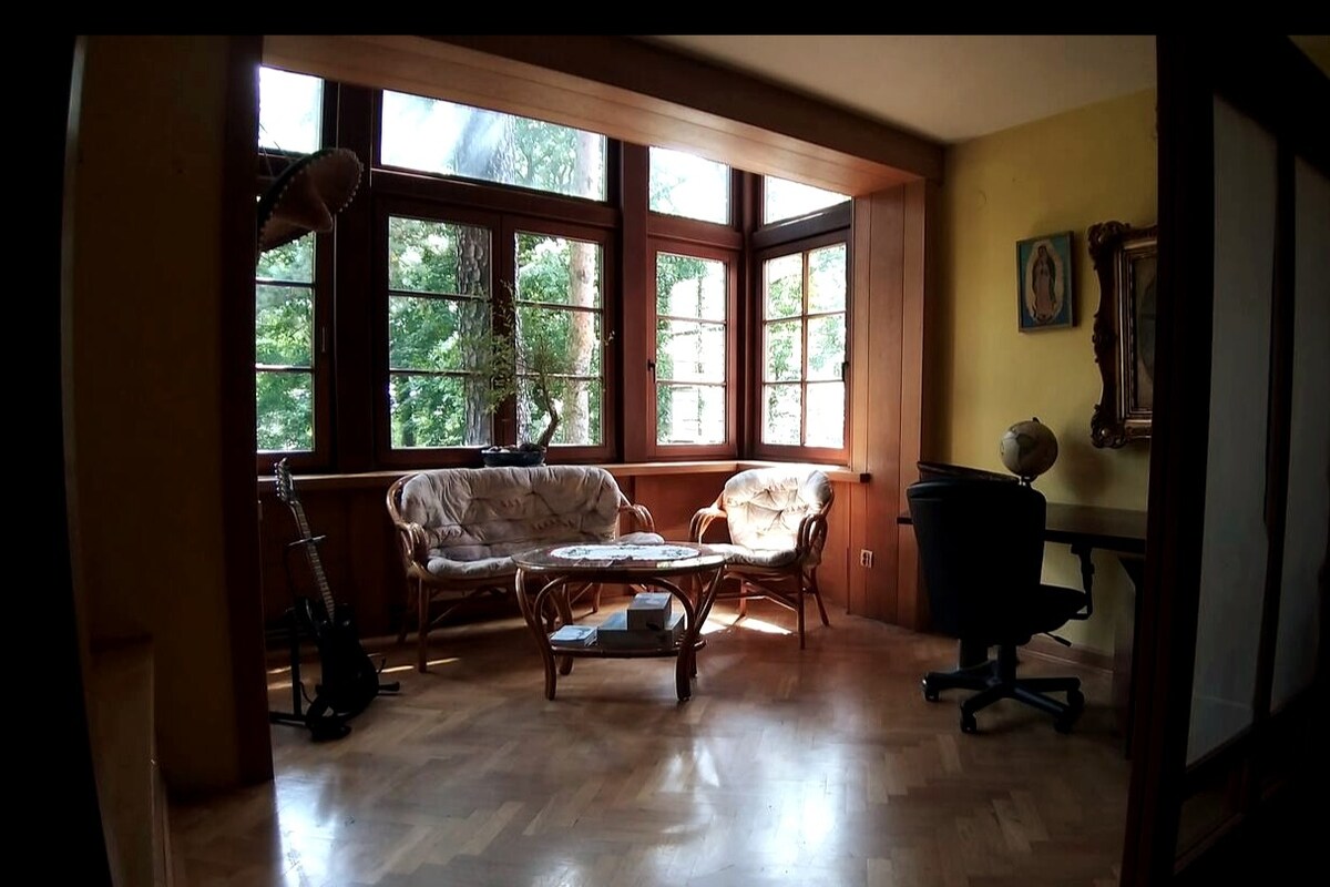 Odpręż się i zrelaksuj w tej spokojnej, stylowej przestrzeni. Oferuję dom do wynajęcia o powierzchni około 300 m2 na leśnej działce.W ciepłych miesiącach codziennie słychać śpiew ptaków. Na zewnątrz znajduje się kuchnia letnia, palenisko, stól na 12 osób z zadaszeniem, oraz ogromny 150 m2 taras. Ogród jest urządzony w nowoczesnym stylu angielskim, z kwitnącymi kwiatami Na parterze znajduje się otwarta przestrzeń 120 m2. Na piętrze jest 5 sypialni - 4 lozka podwojne i 2 piętrowe.