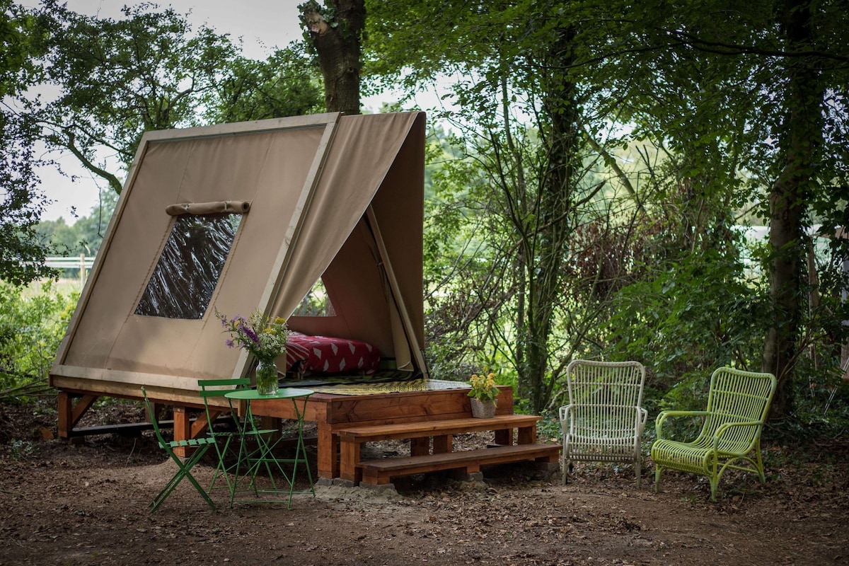 This cozy safari tent on a wooden podium hosts up to 4 people. Its located on 'chestnut field' and has sleeping quarters with a double bed (two connected singles) and a bunk bed. There is also a small table inside the tent. Outside is a veranda with chairs and a table. You can cook in the camping kitchen next to the pond. The 'Oase' with showers and toilets is nearby.