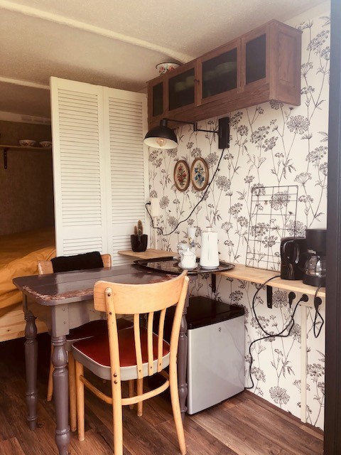 This cozy saloon car is in the yard between the horses, chickens and geese. Enjoy the simplicity of this nice place with a fireplace, your own kitchen, box bed and 'outdoor' shower and toilet (see photos). The car can be heated by a pellet stove and equipped with all comforts for a restful stay. A made bed, clean towels, kitchen linen and final cleaning are included in the price.