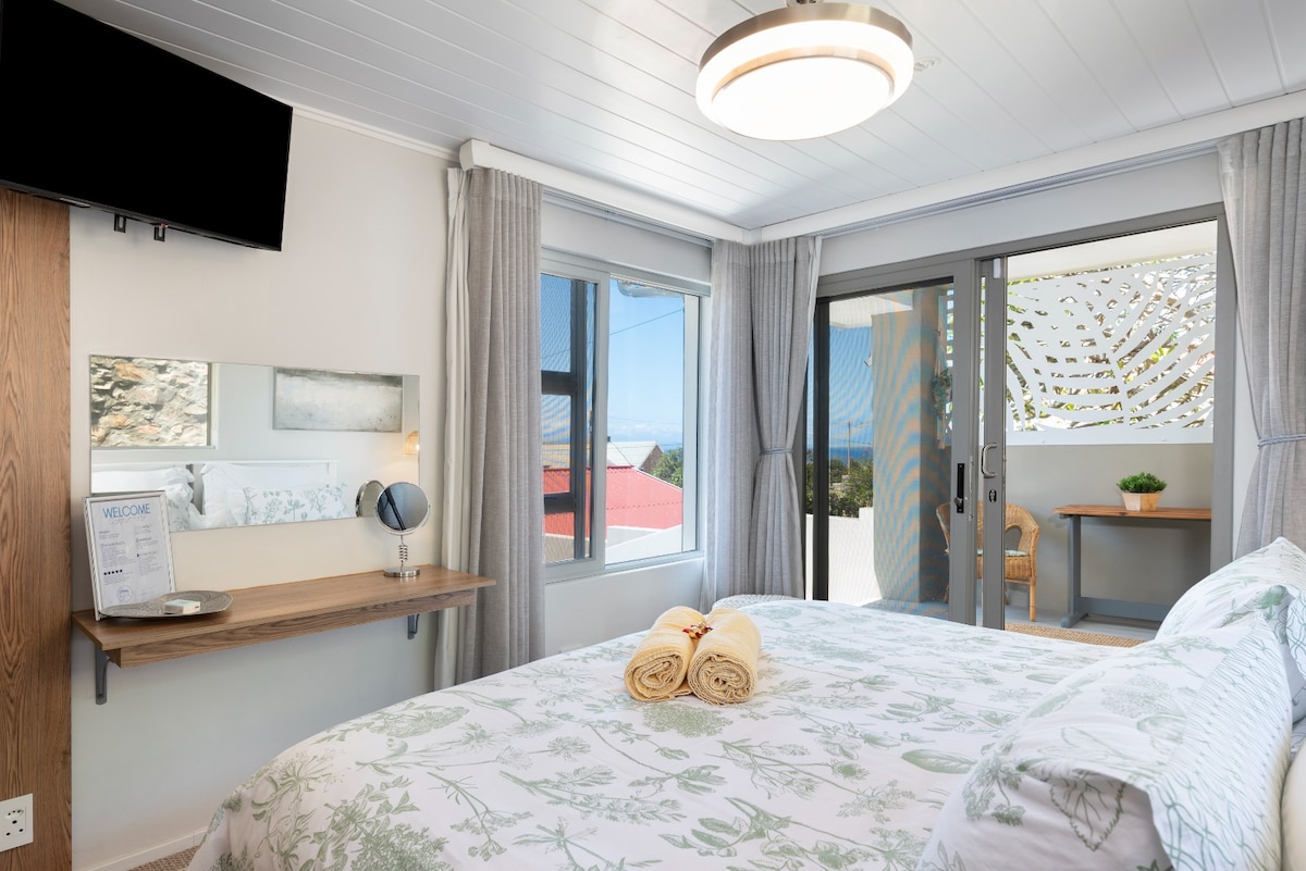 Soak in panoramic views of the Outeniqua Mountains from this light-filled, open-plan studio. Surrounded by indigenous trees. The upstairs studio features large windows, a fully equipped kitchen, queen-sized bed, and en-suite bathroom. Natural light fills the space, creating an inviting atmosphere. Downstairs, with its own private entrance, is a spacious second bedroom with a queen-sized bed, en-suite bathroom, and a small table and chairs.