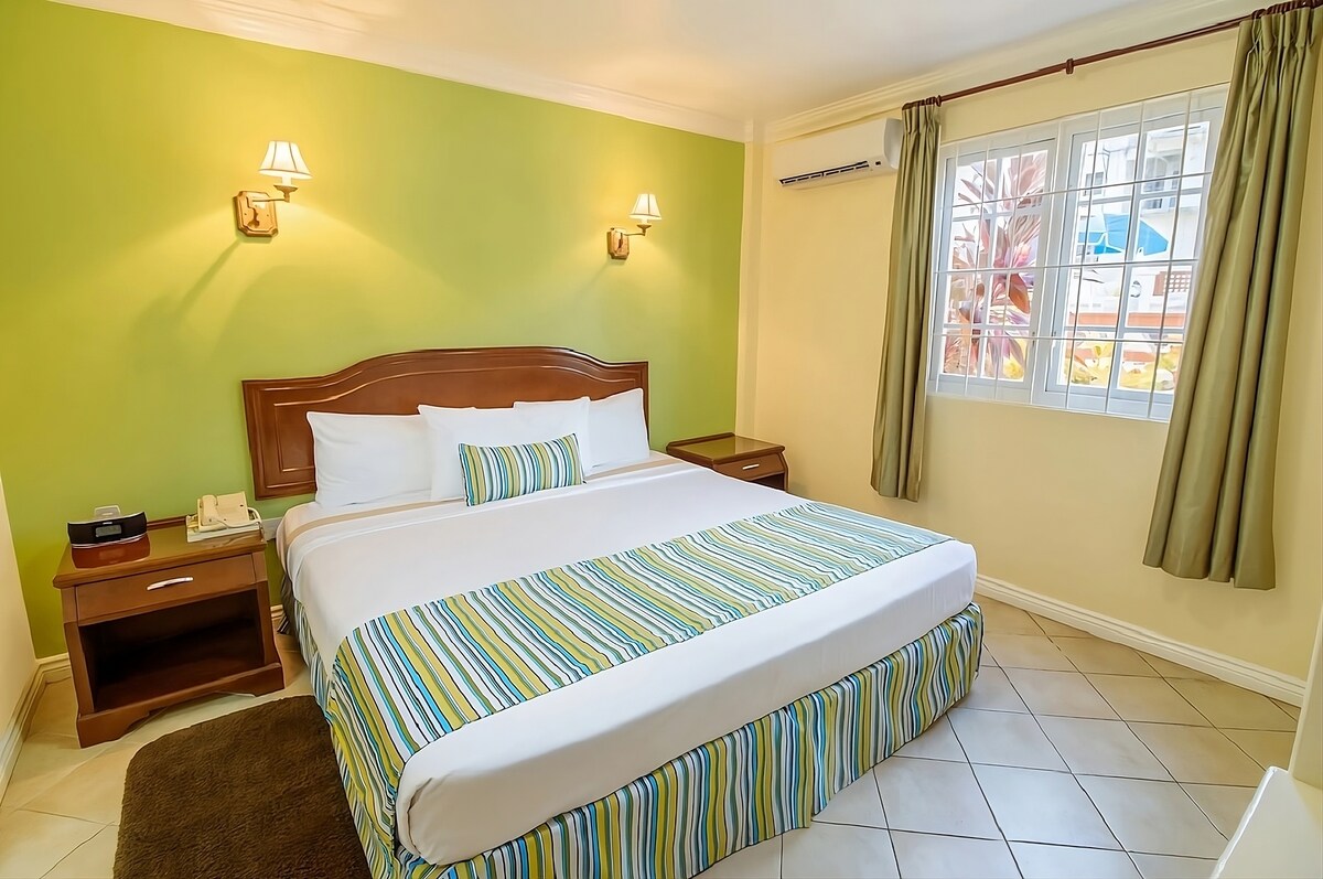 This Standard room with views of the Gardens and Hillside. Rooms come with either a King bed or two Full size beds (Based on availability) All en-suite bathrooms feature granite vanity tops, hairdryers and illuminated magnifying mirrors. All rooms offer free high-speed Wireless Internet Access, USB charge ports, dual voltage throughout (110v/220v) and coffee/tea facilities. Room comes with daily Housekeeping, Pool Access, Gym Access and complimentary Buffet Breakfast at Ti Bananne Restaurant.