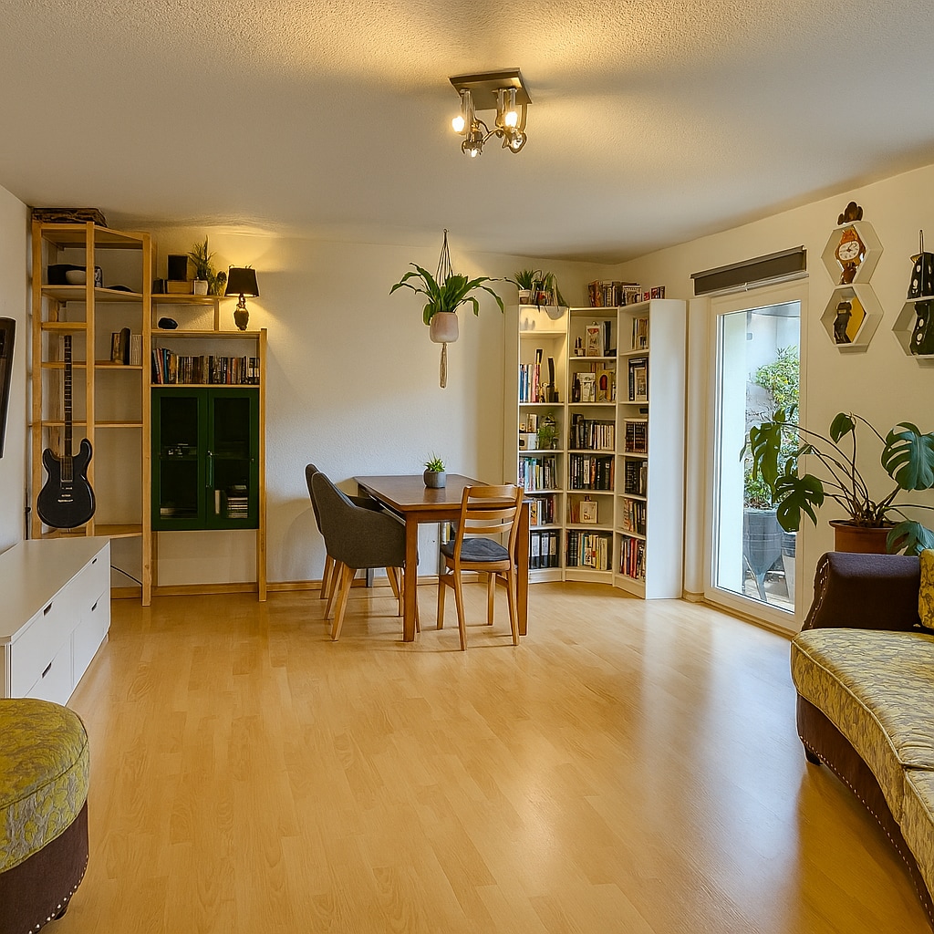 30qm Wohnung in saniertem Zweifamilienhaus Eingangsbereich Hauptraum 1,60m Bett, Couch (mit Schlaffunktion in 1,30m Breite), Esstisch als Anrichte ausgeführt Küche voll ausgestattet (Premium Geräte, Kaffee, Tee, Trinkschoki for free) gegenüber Doppel-Waschtisch links davon Eingang zur offenen Regen-Dusche rechts davon Toilette (abschließbare Tür) el. Rolläden Hauptraum & Klo Plissees an allen Fenstern Fahrzeug(e) kann direkt vorm Grundstück geparkt werden (Sackgasse)! Hof noch nicht saniert
