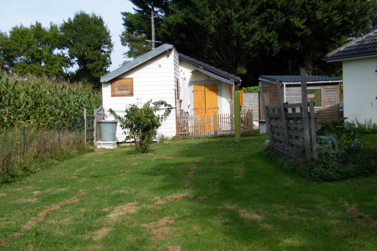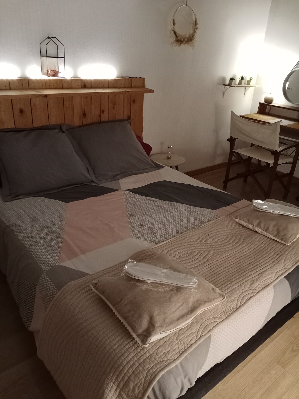 Gîte de 45 m2 : RDC : entrée , placard, cuisine équipée: plaque électrique 4 feux, four , frigo , petit électroménager , batterie de cuisine . coin repas avec table , chaises , buffet renfermant la vaisselle ; salon avec cheminée équipée d'1 poêle à bois , canapé convertible , bibliothèque; salle d'eau avec douche , lavabo et radiateur sèche serviettes ; wc indépendant avec machine à laver le linge planche et fer à repasser . A l'étage 1 chambre avec 3 lits de 90*190